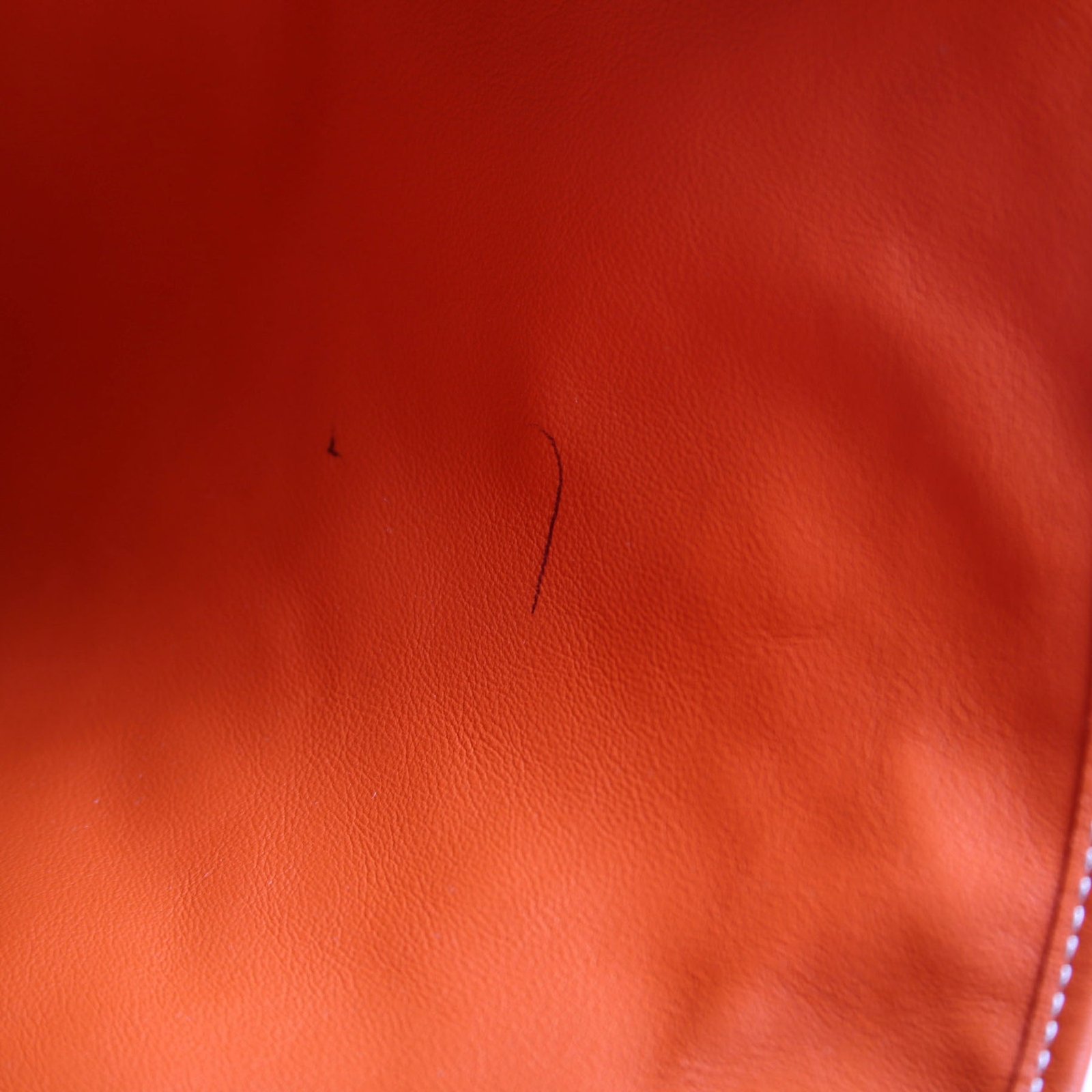 Interior: The interior has pen marks and stains throughout and features one removable pouch. The pouch features an open pocket on the back.