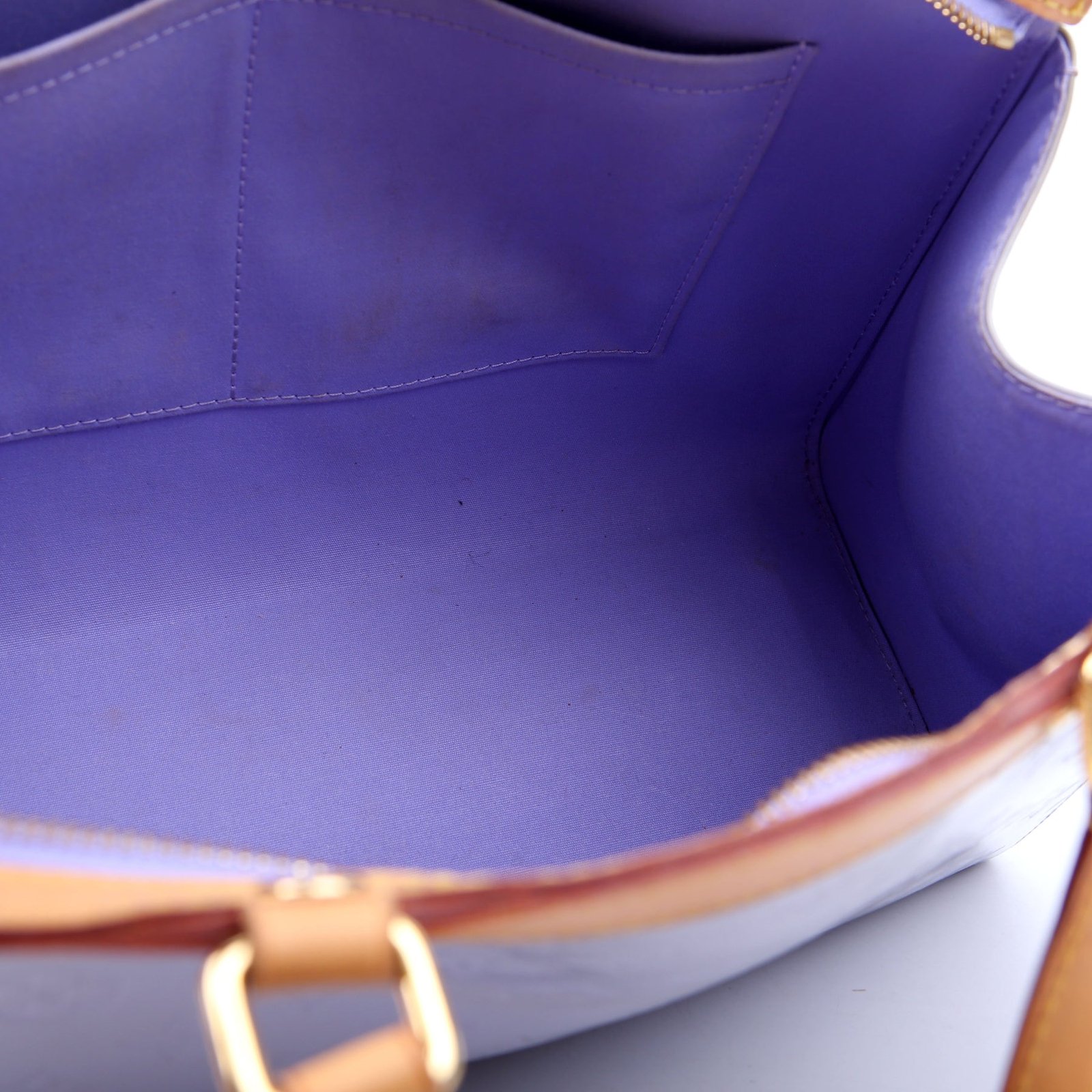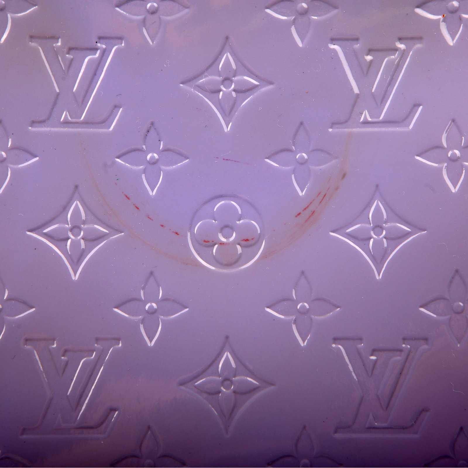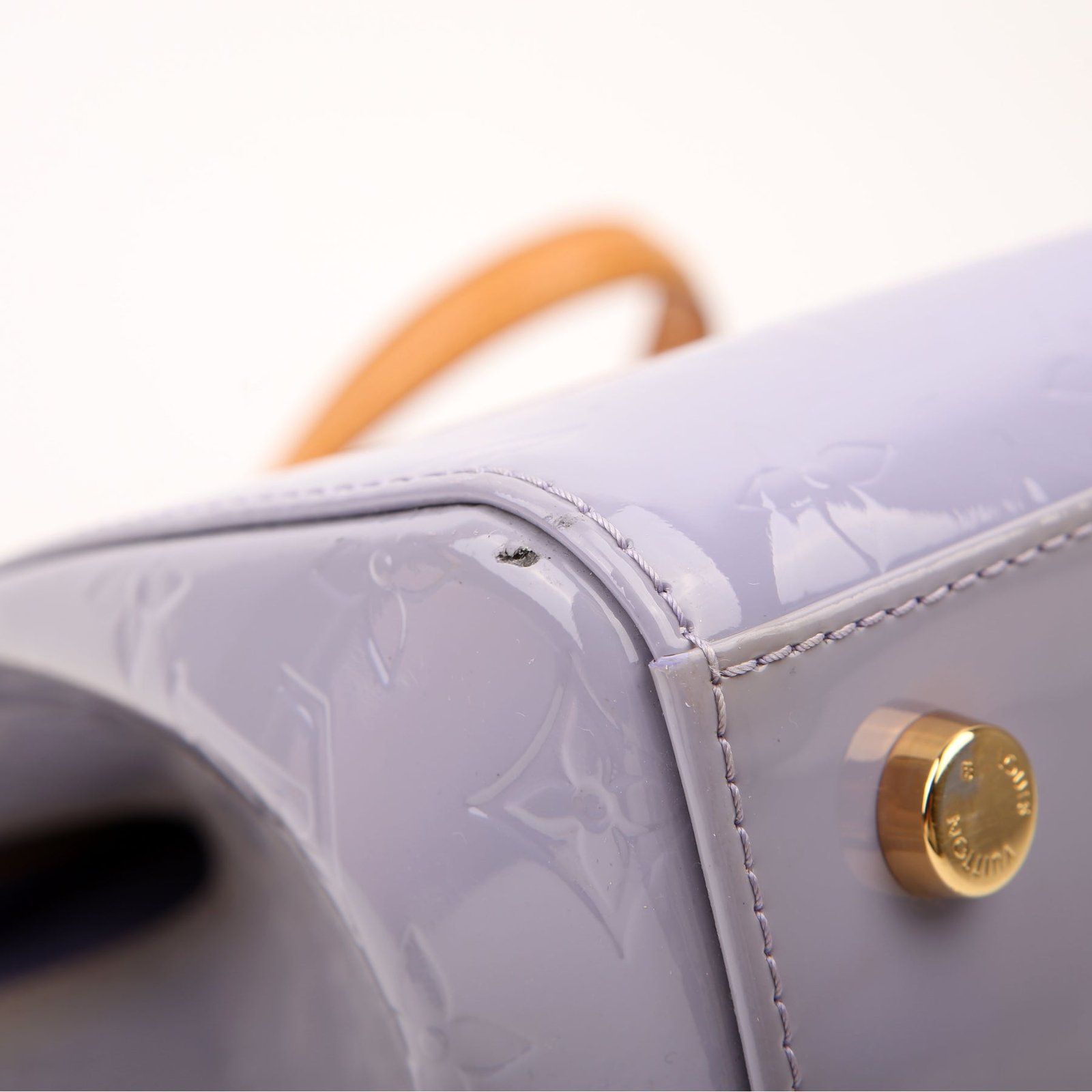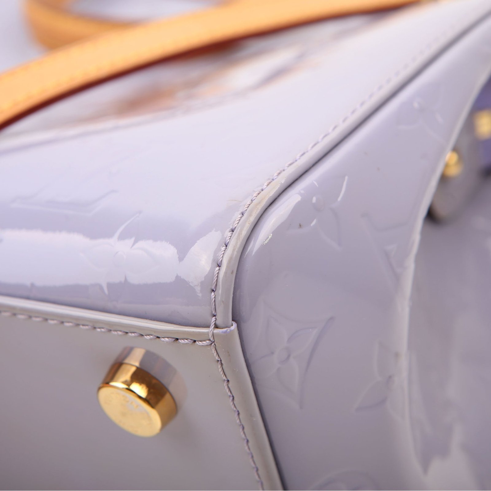 Exterior: The exterior leather is free of any rips or cracks. The leather trim shows light scuffs and rubbing. The vernis leather shows fading and discoloration throughout.