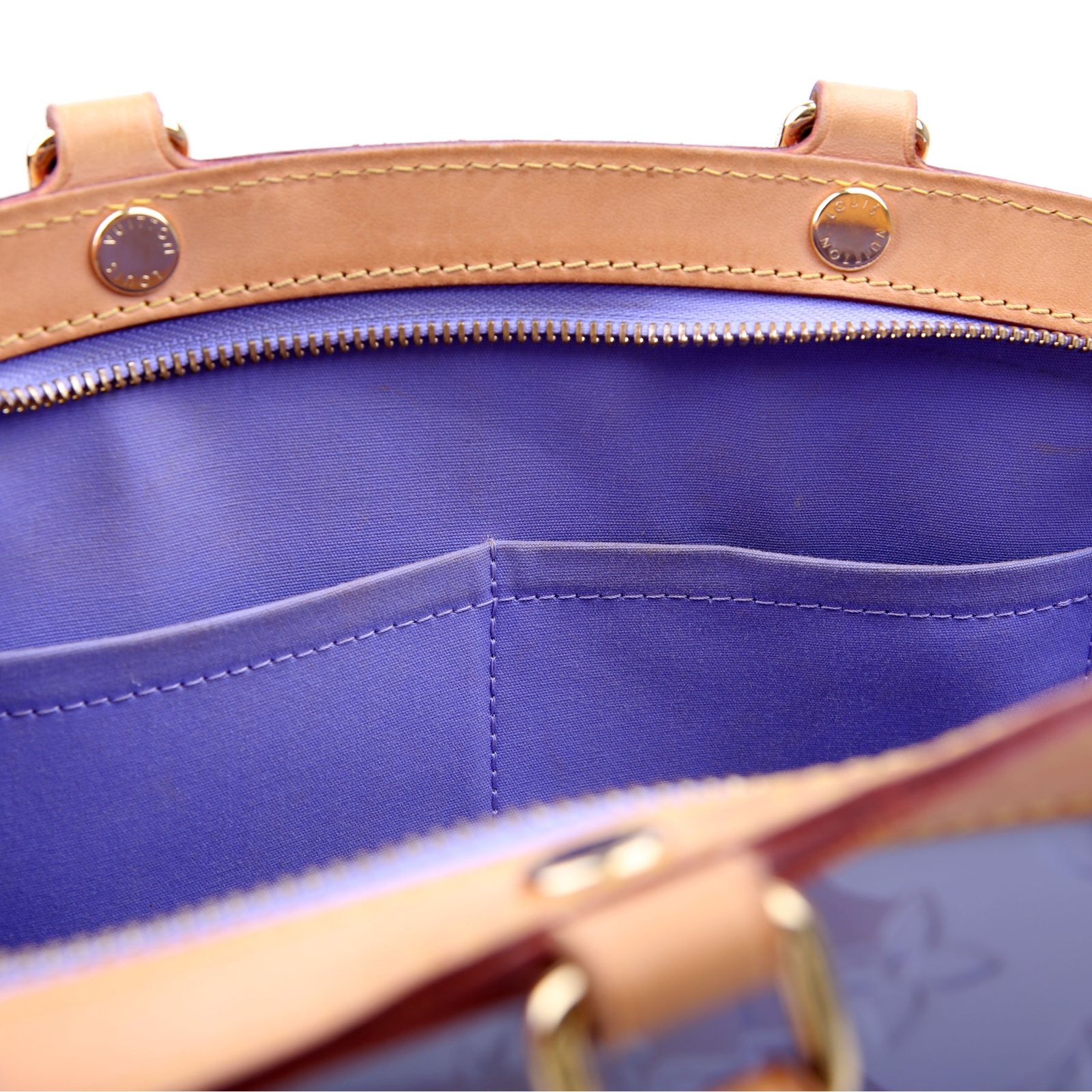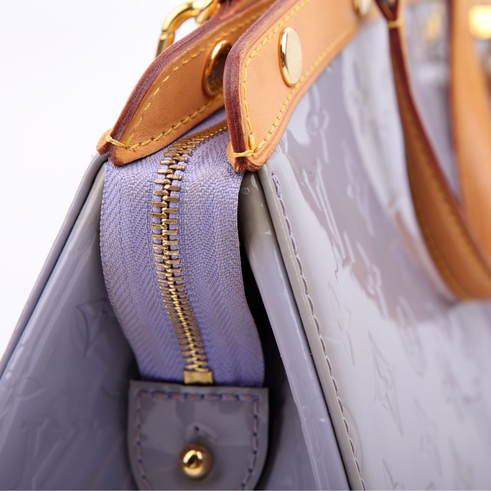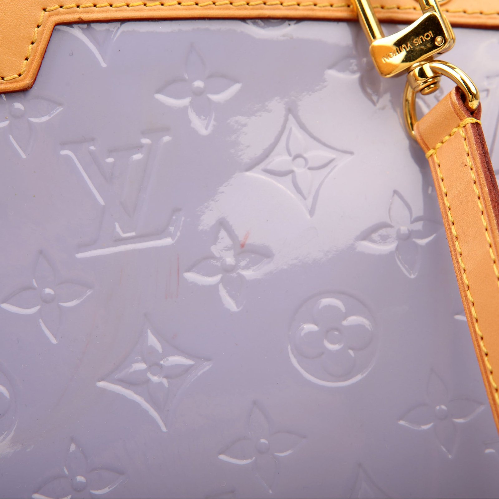 Exterior: The exterior leather is free of any rips or cracks. The leather trim shows light scuffs and rubbing. The vernis leather shows fading and discoloration throughout.