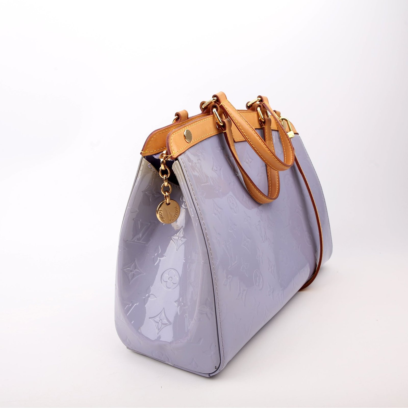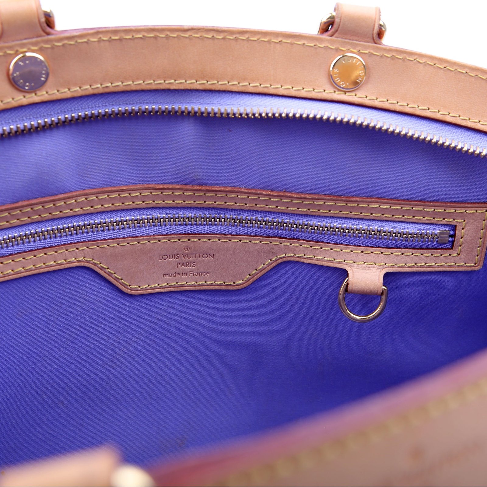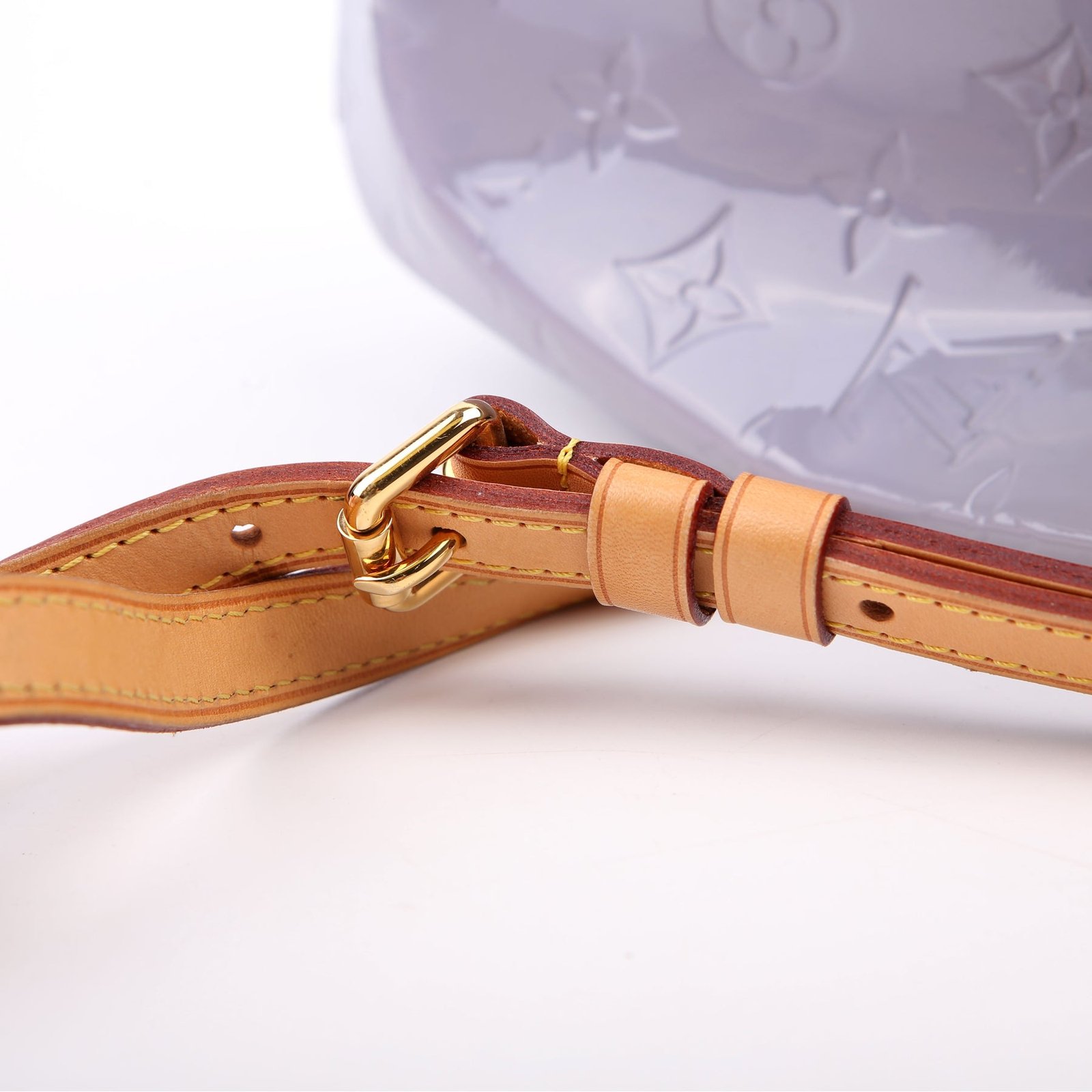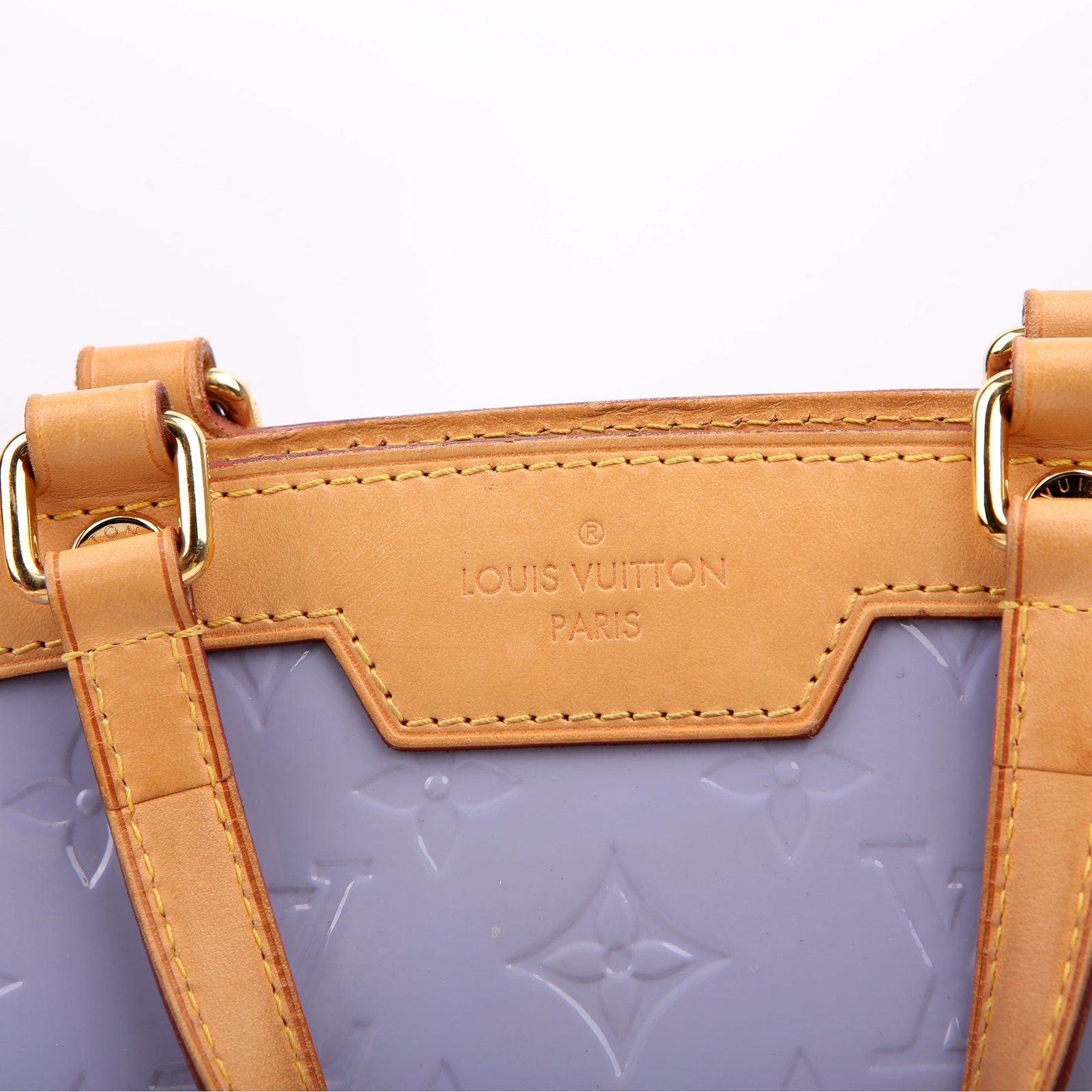 Exterior: The exterior leather is free of any rips or cracks. The leather trim shows light scuffs and rubbing. The vernis leather shows fading and discoloration throughout.