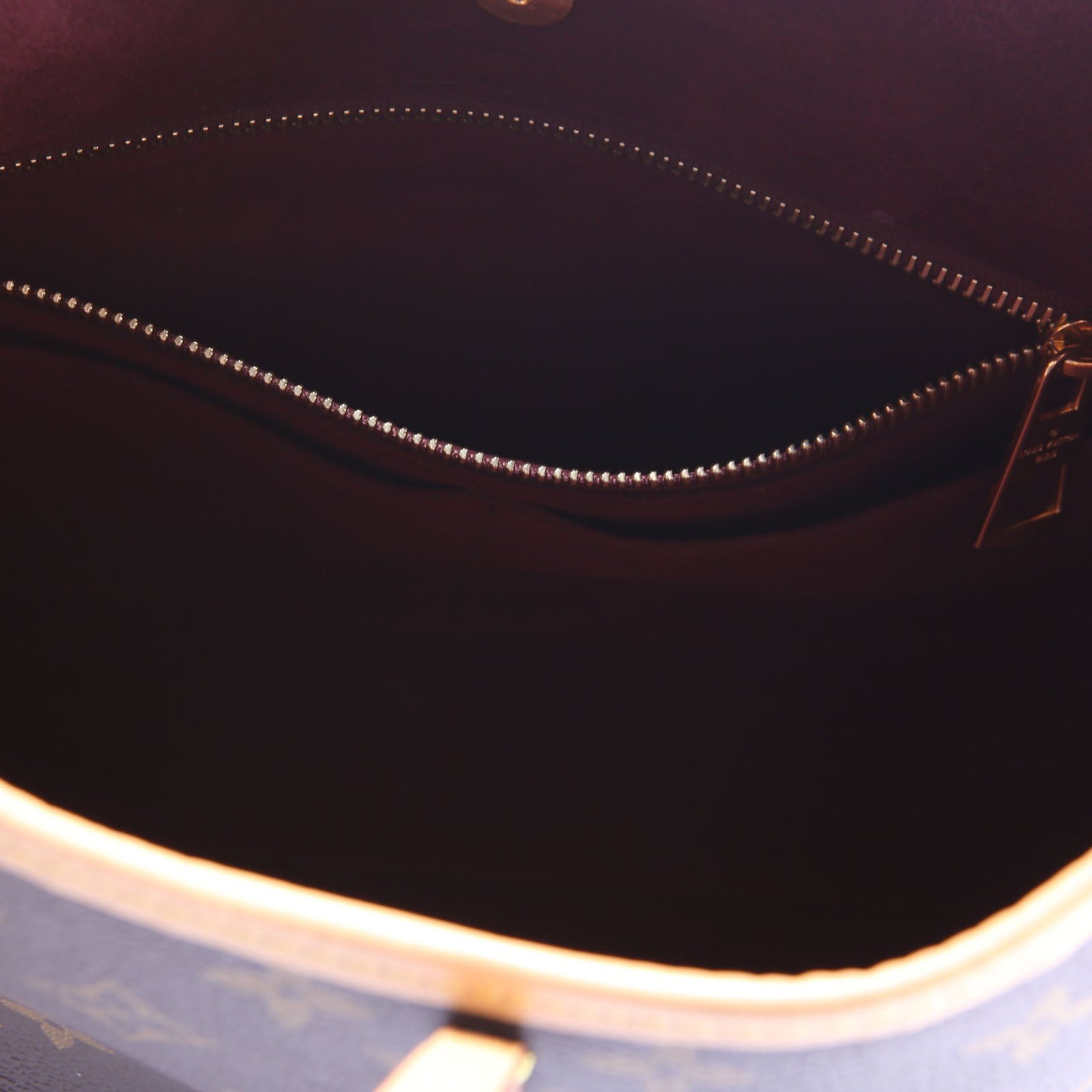 Interior: Free of wear and features one zip closure pocket, two open pockets, and one removable pochette.
