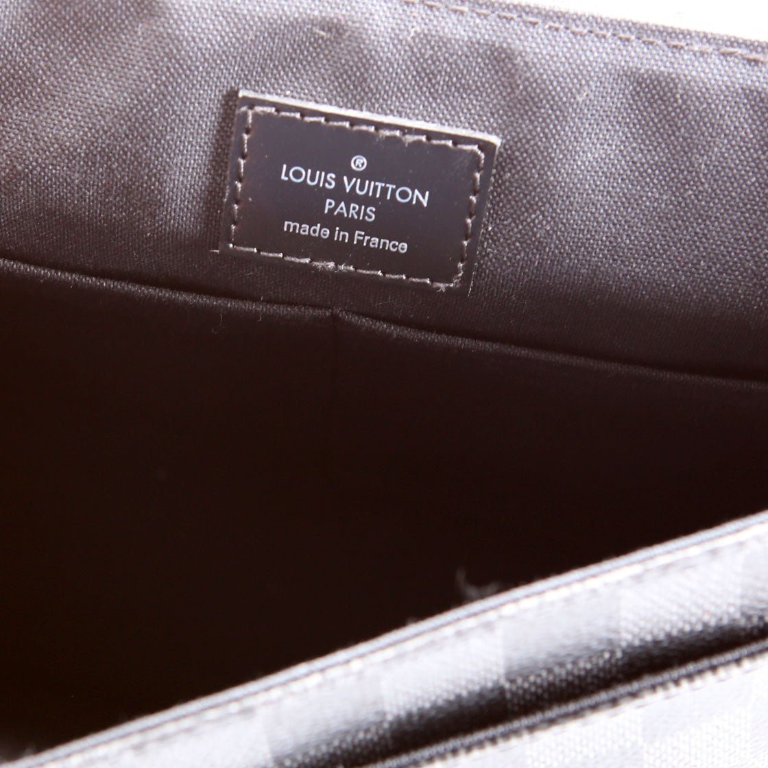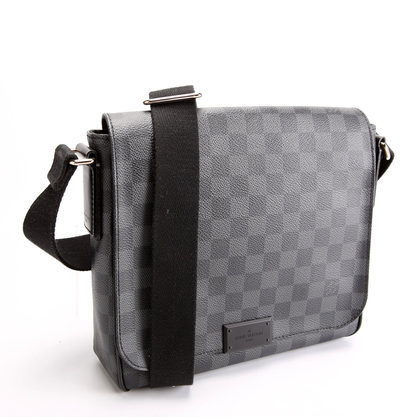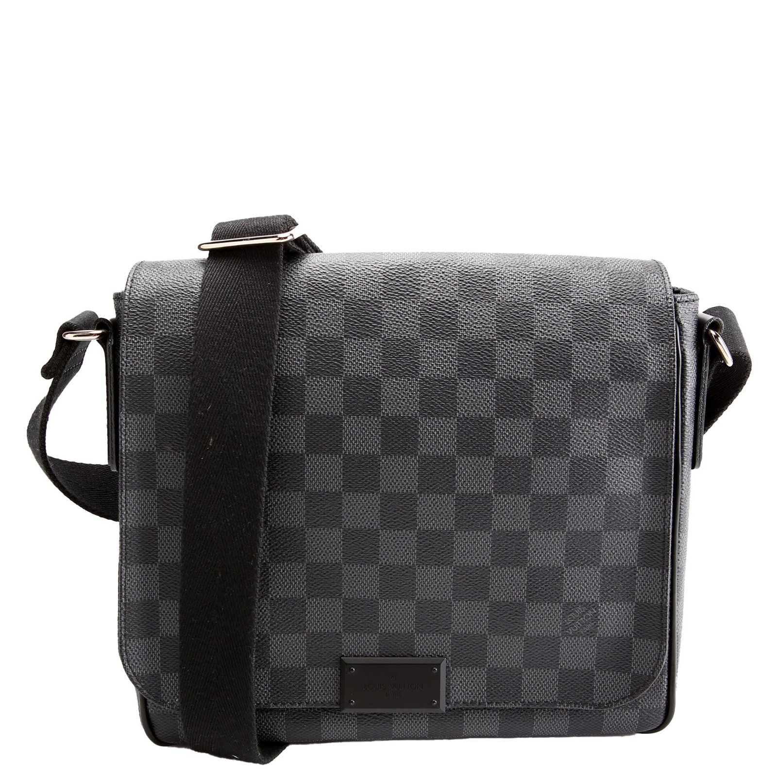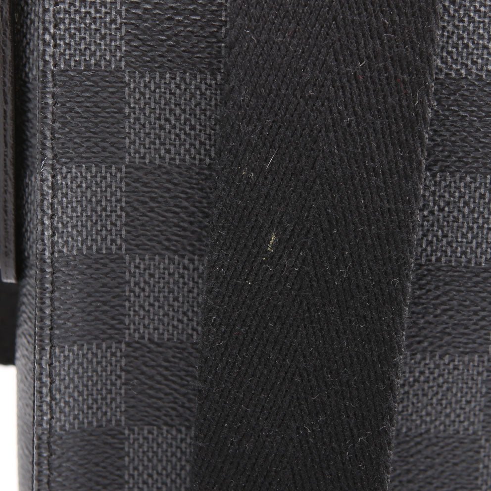 This pre-owned Louis Vuitton District Pm is guaranteed 100% authentic. The exterior is in the classic Louis Vuitton Damier Graph Coated Canvas