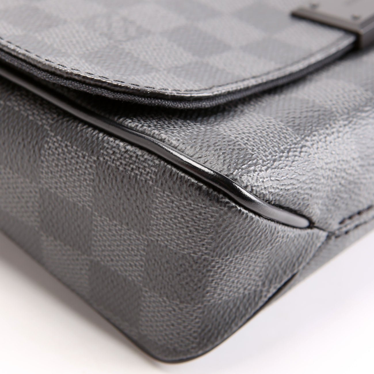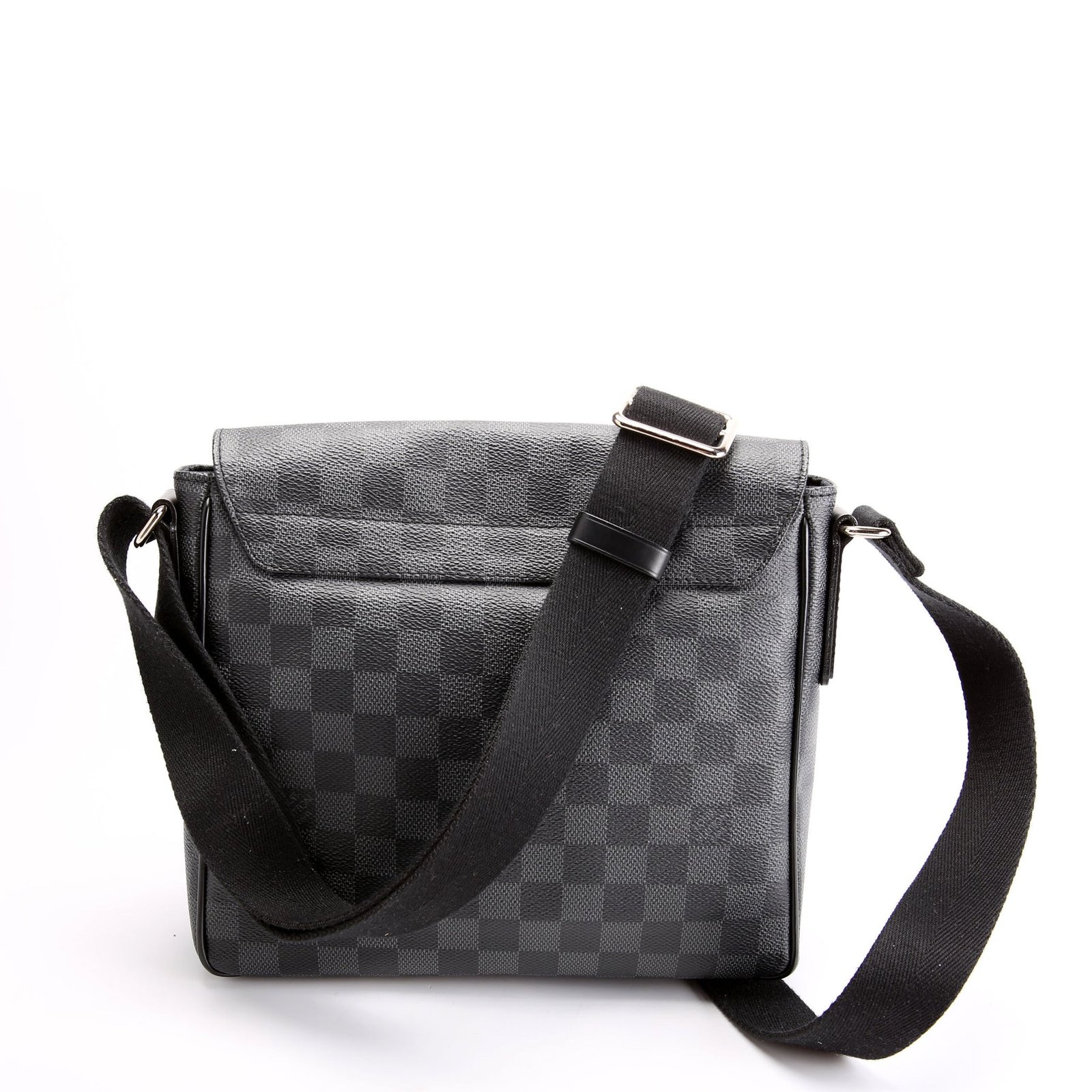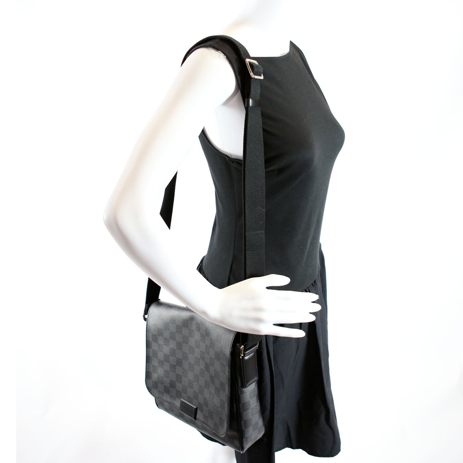 This pre-owned Louis Vuitton District Pm is guaranteed 100% authentic. The exterior is in the classic Louis Vuitton Damier Graph Coated Canvas