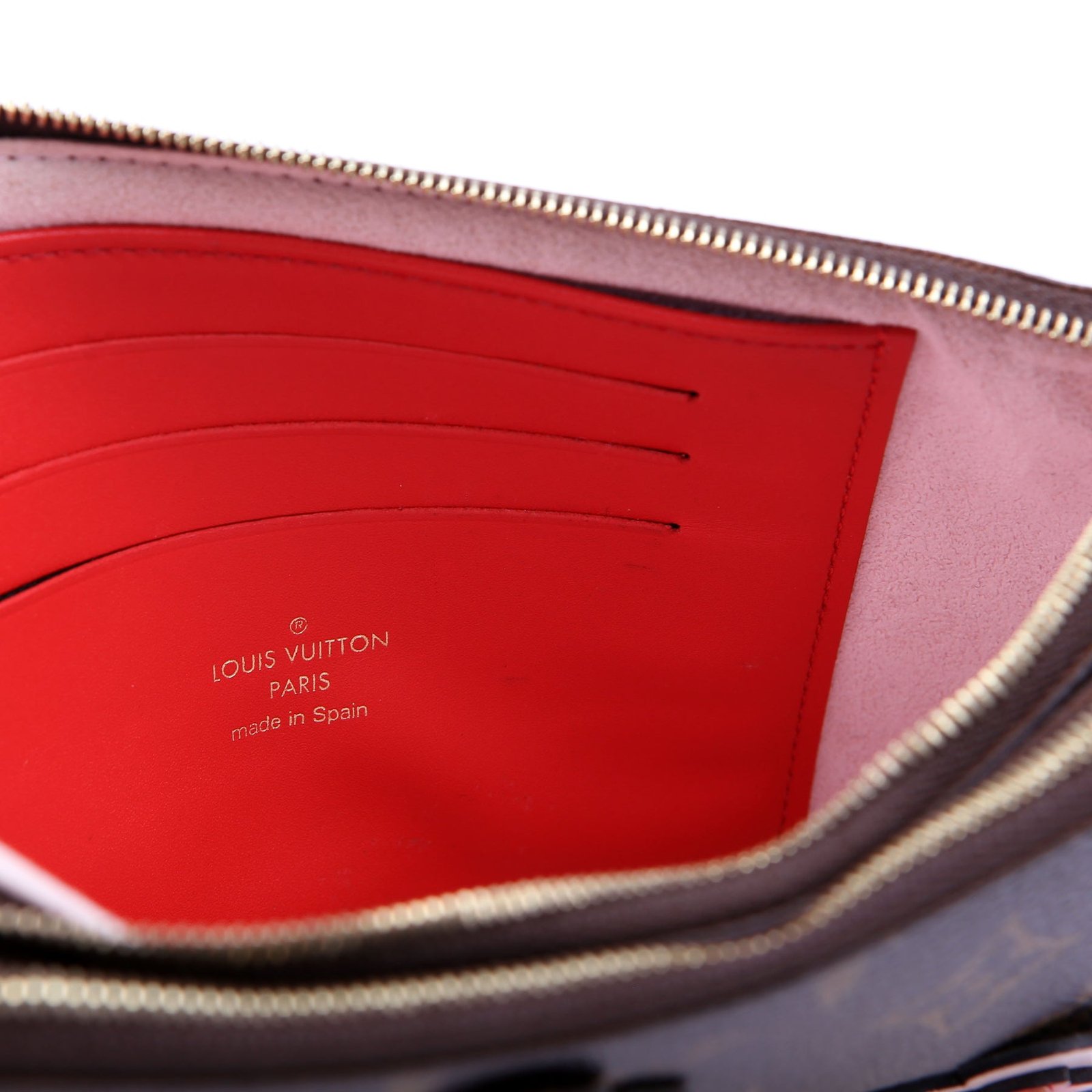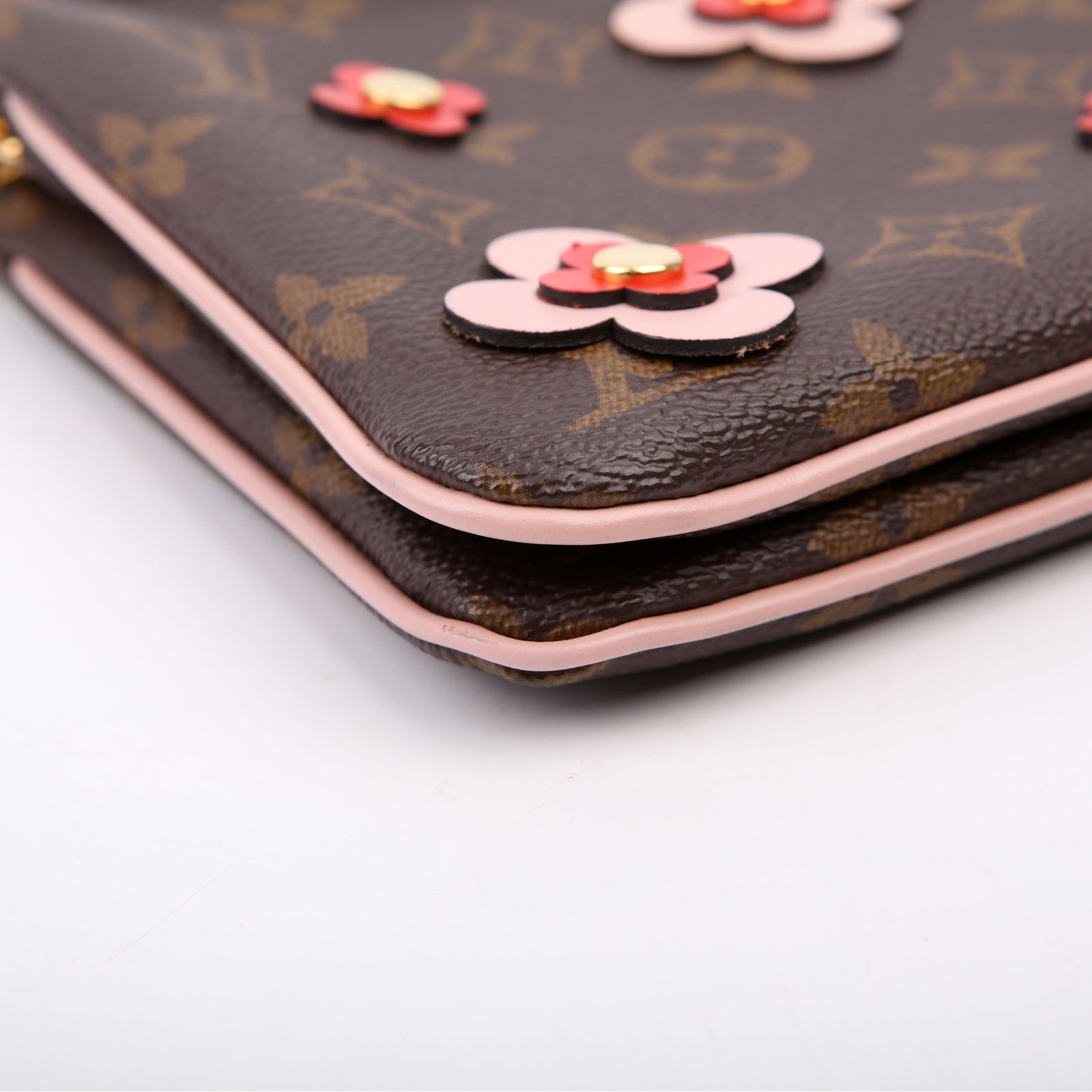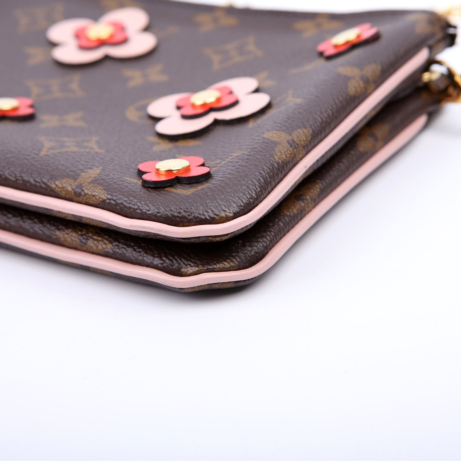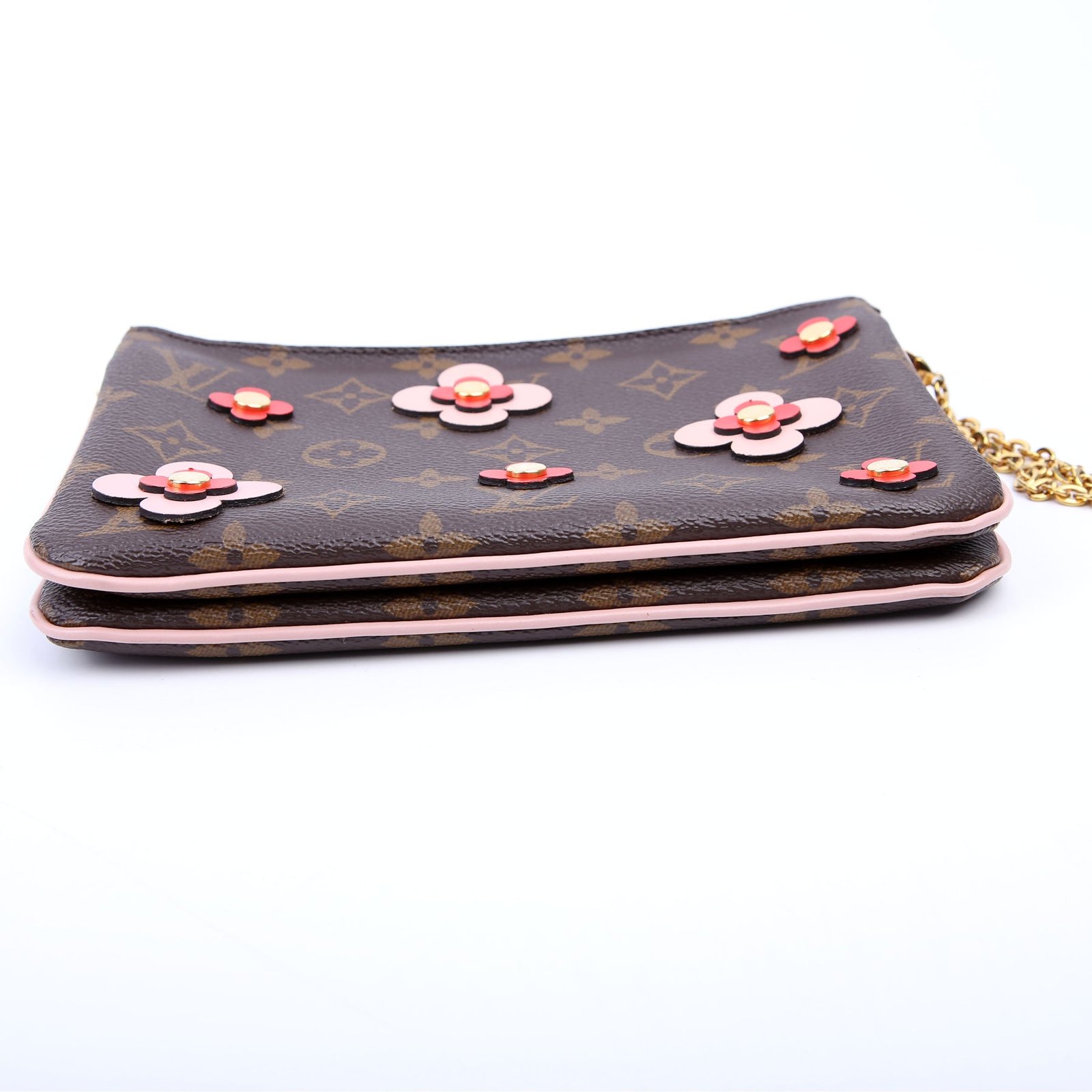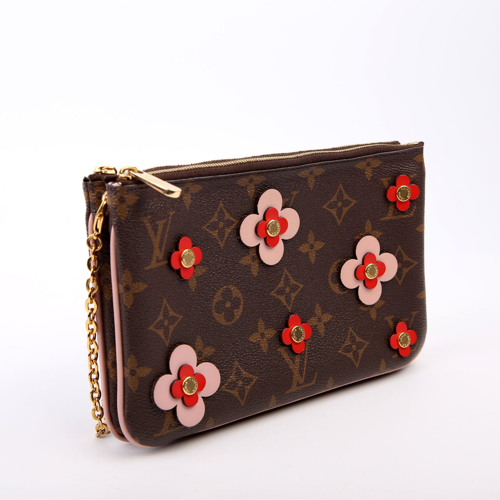 This pre-owned Louis Vuitton Double Zip Pochette Blooming Flowers is guaranteed 100% authentic. The exterior is in the classic Louis Vuitton Monogram coated canvas.