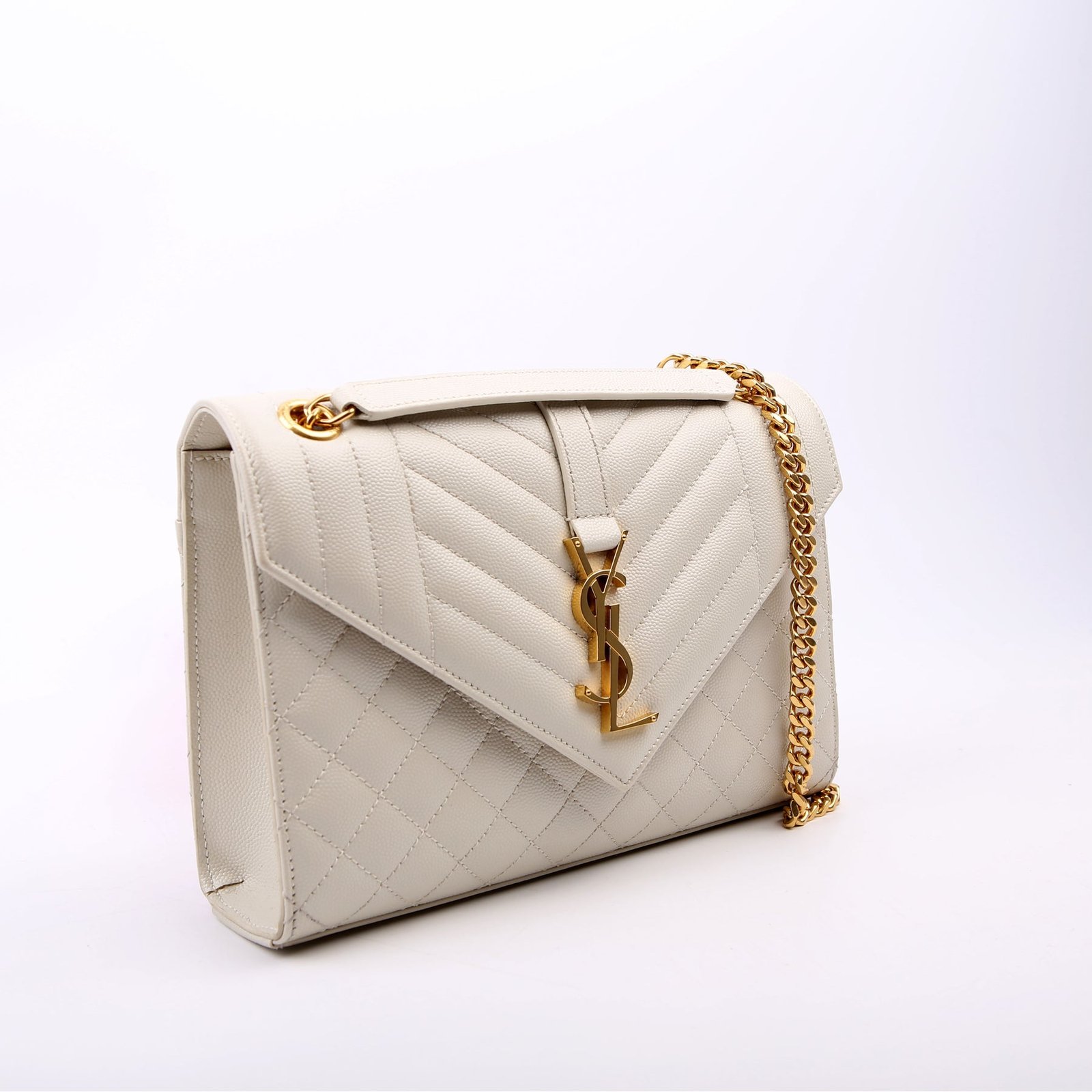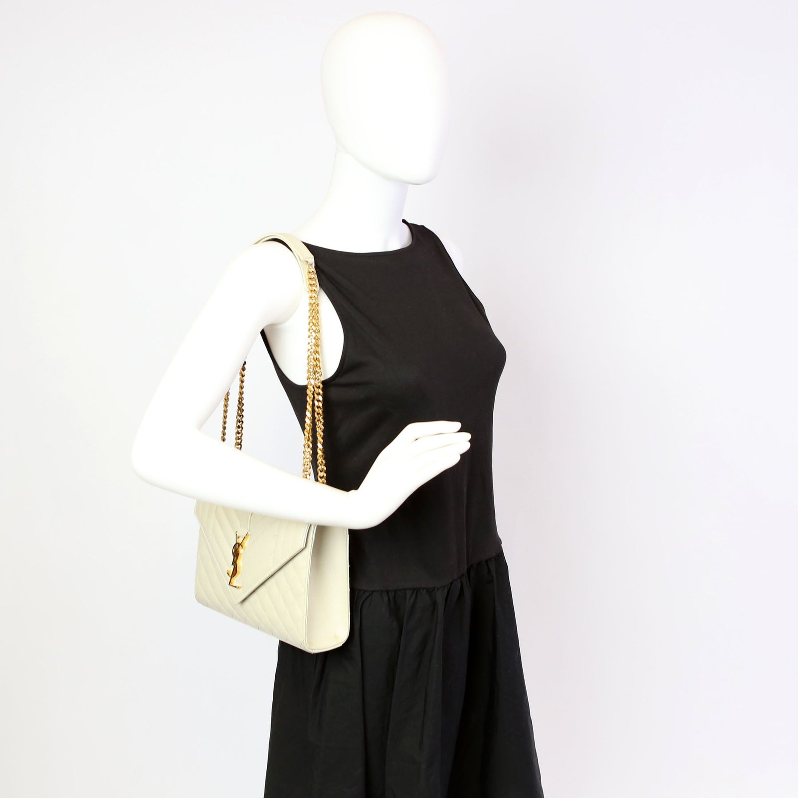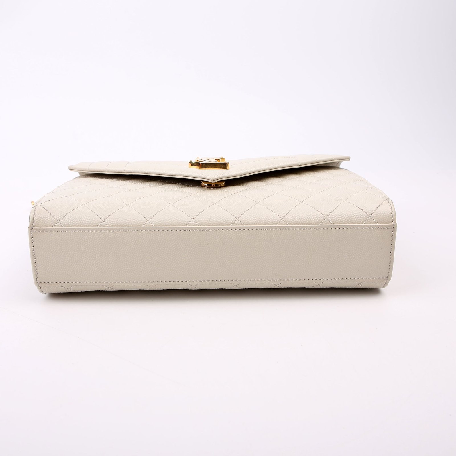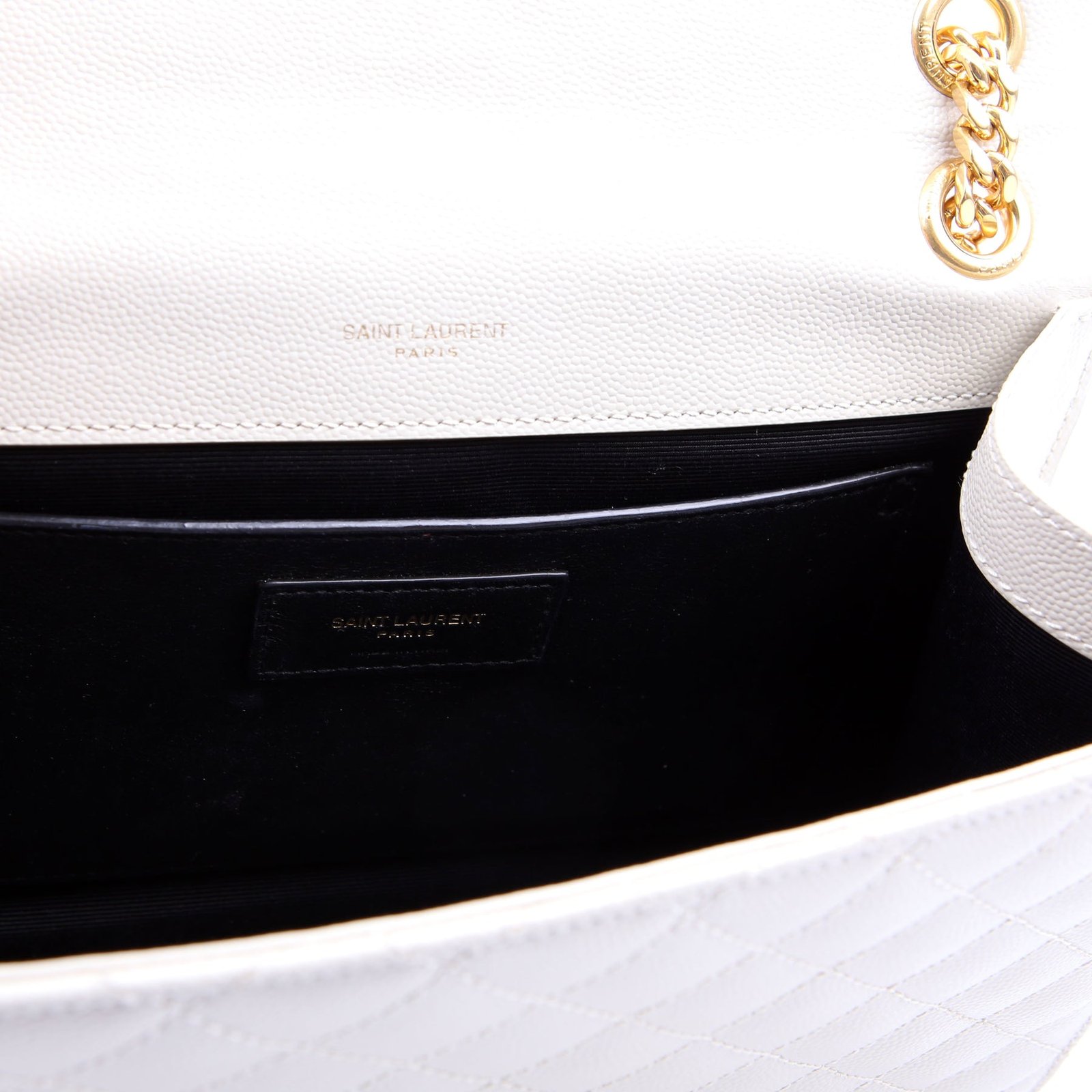 This pre-owned Saint Laurent Envelope Medium Triquilt is guaranteed 100% authentic. The exterior is in the classic Saint Laurent Grain De Poudre.