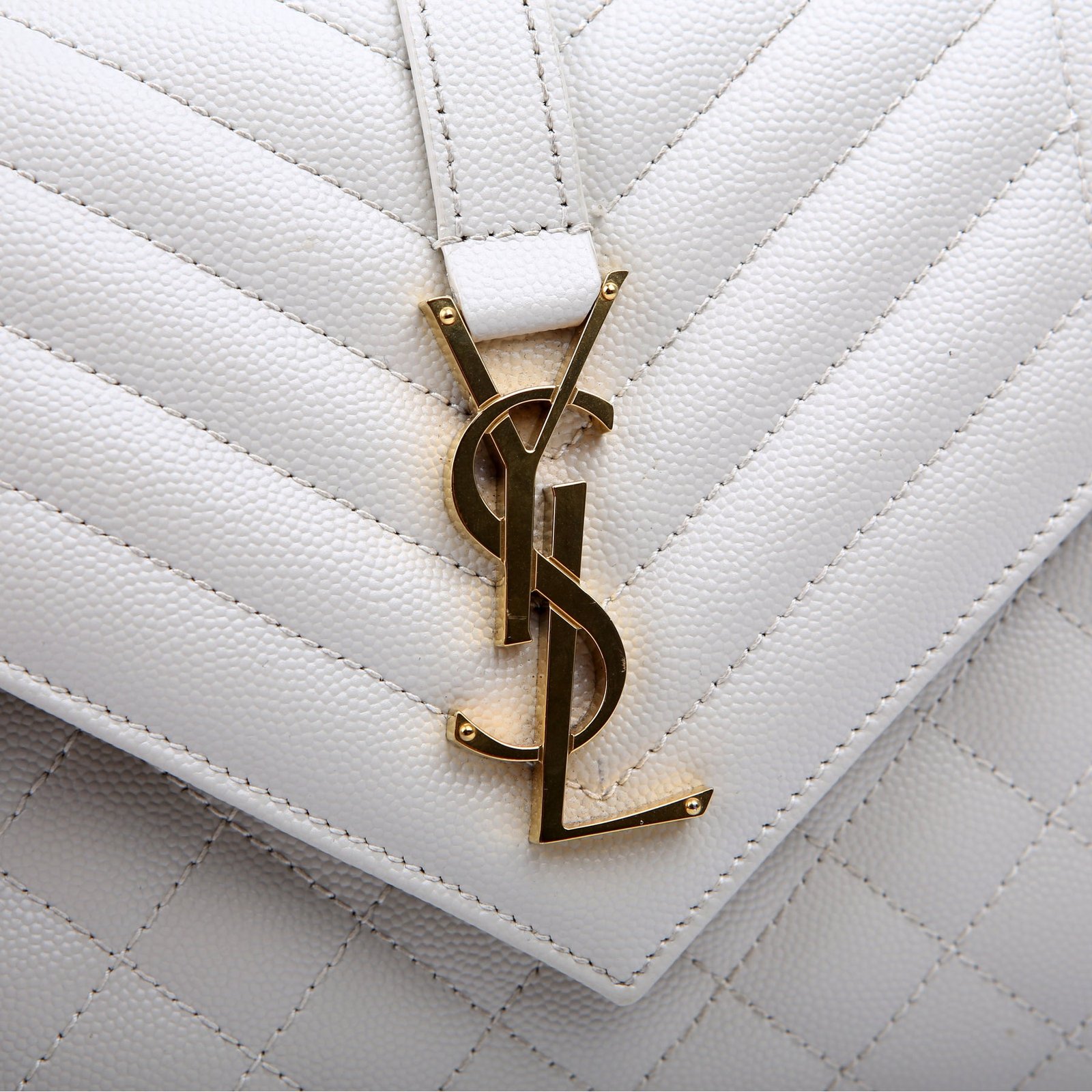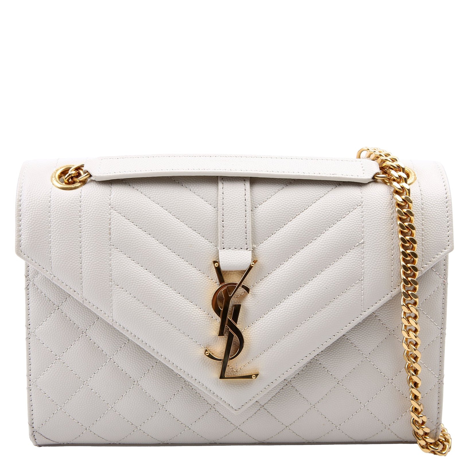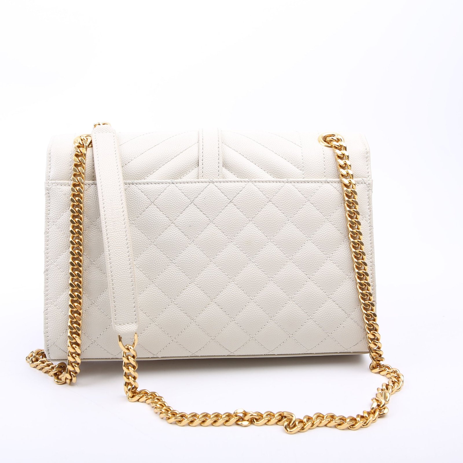 This pre-owned Saint Laurent Envelope Medium Triquilt is guaranteed 100% authentic. The exterior is in the classic Saint Laurent Grain De Poudre.