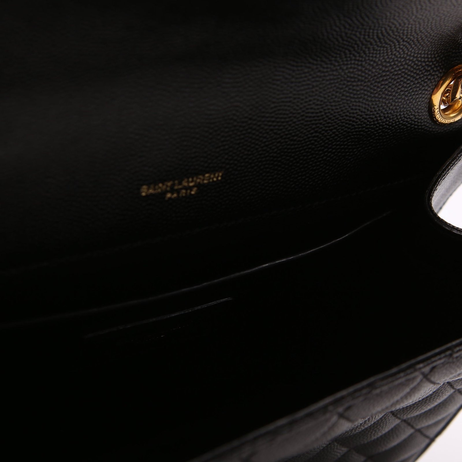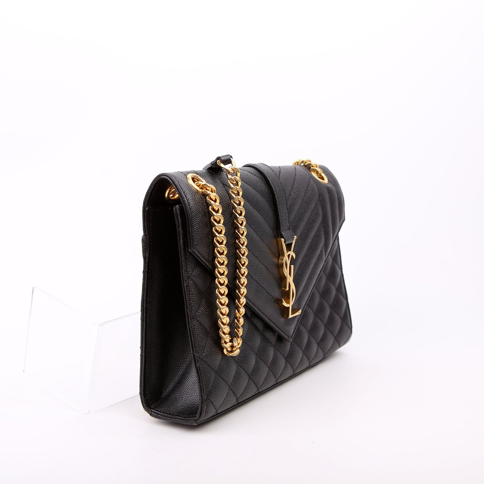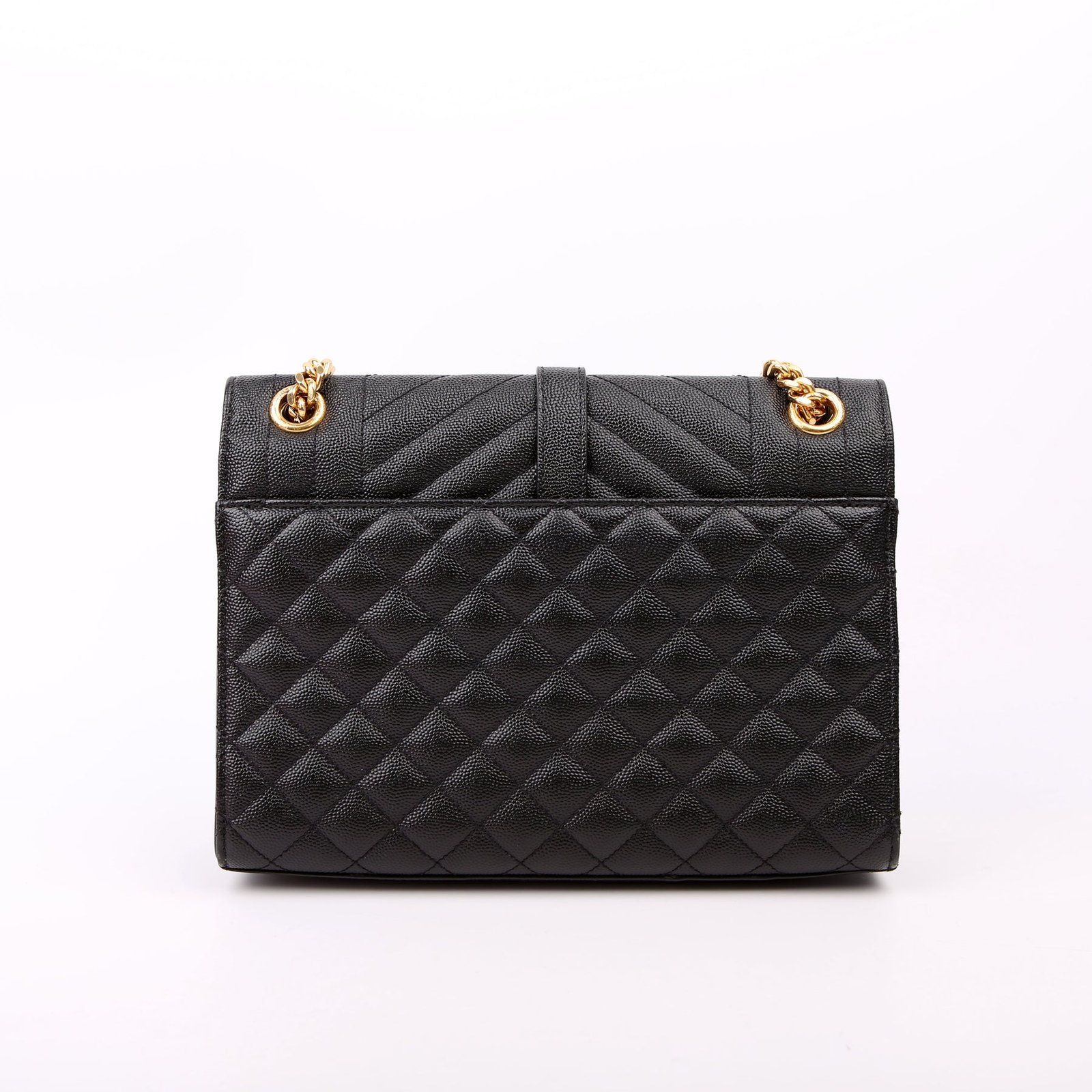 This pre-owned Saint Laurent Envelope Medium Tri-Quilted Bag is guaranteed 100% authentic. The exterior is in the classic Saint Laurent Quilted Leather.