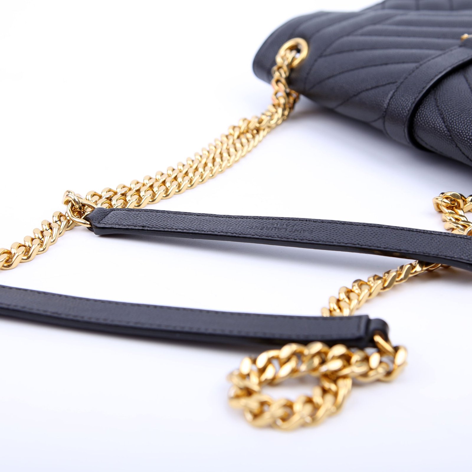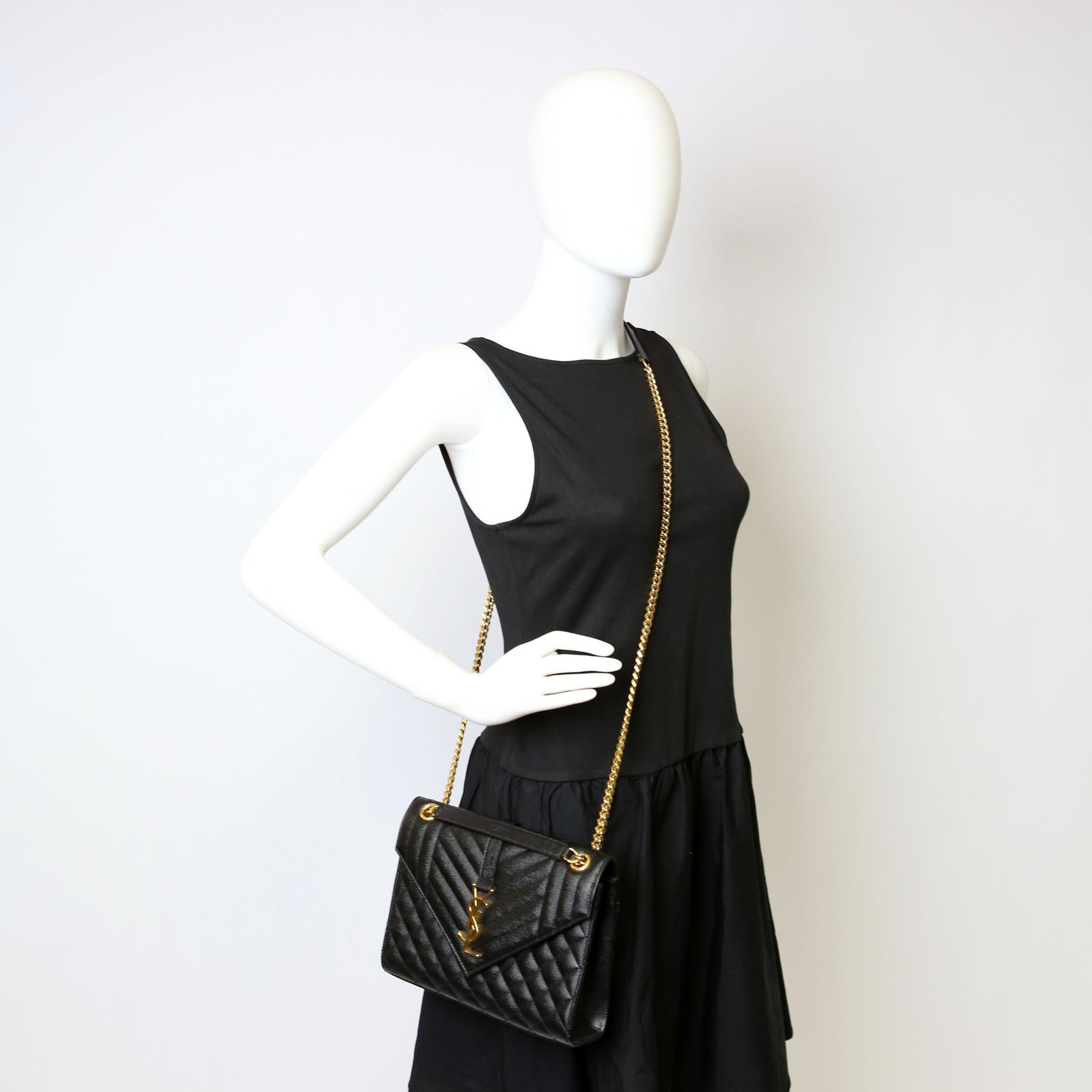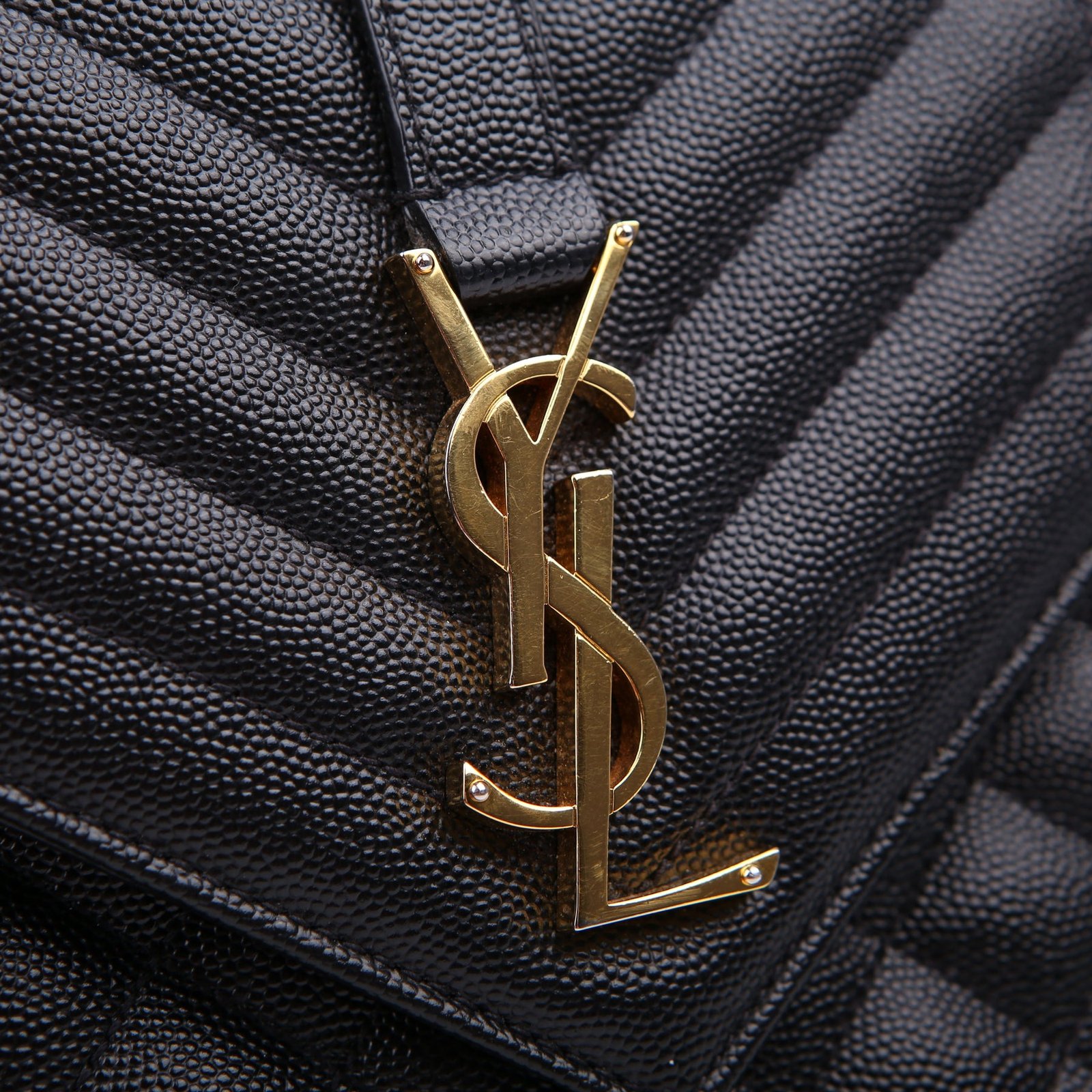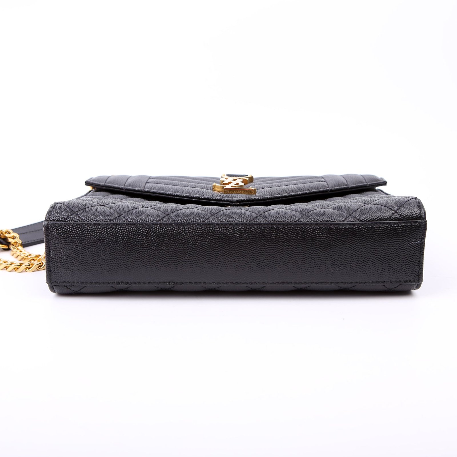 This pre-owned Saint Laurent Envelope Medium Tri-Quilted Bag is guaranteed 100% authentic. The exterior is in the classic Saint Laurent Quilted Leather.