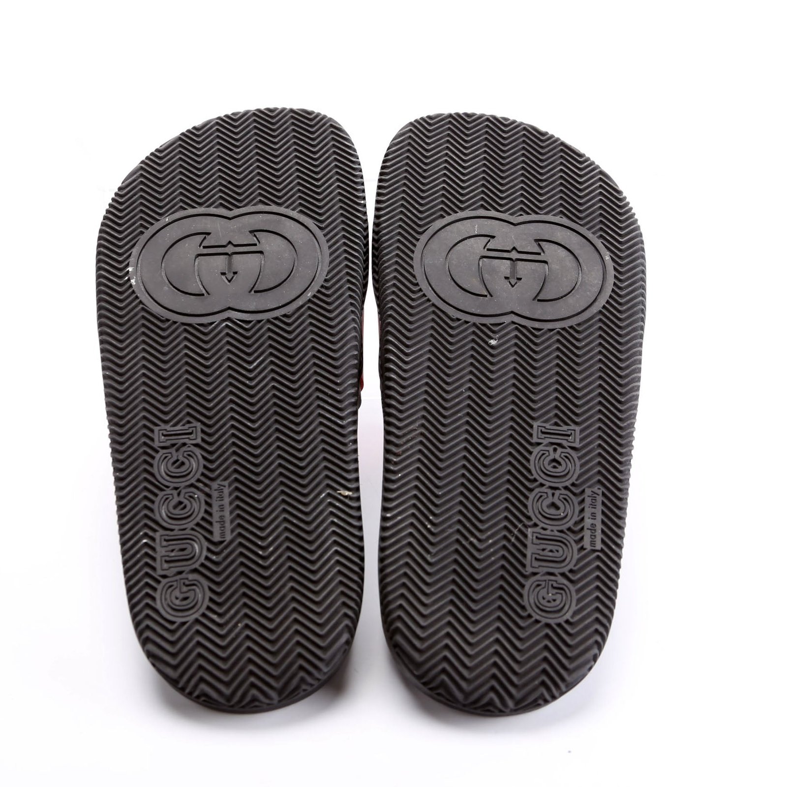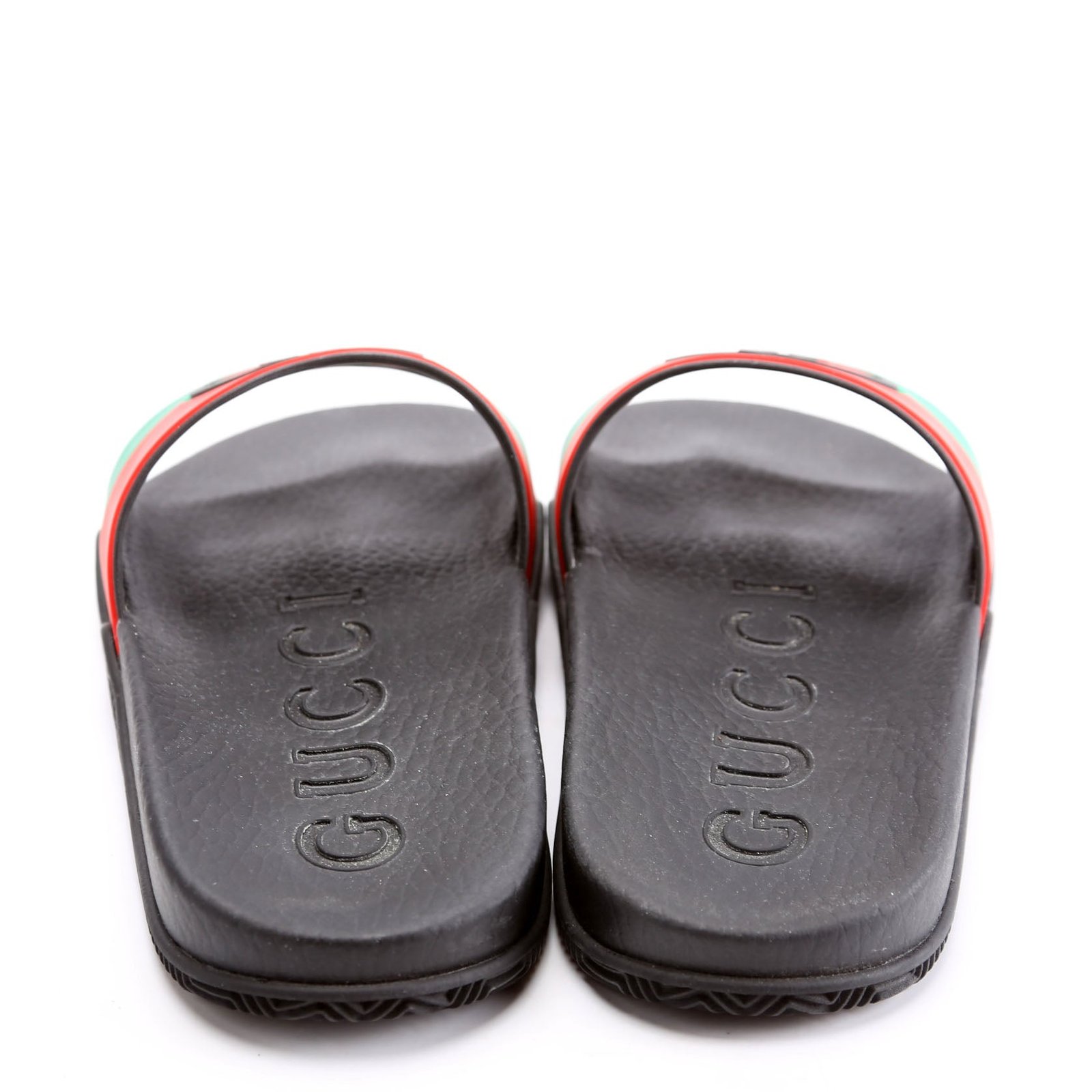 These pre-owned Gucci Interlocking G Web Stripe Slides are guaranteed 100% authentic.