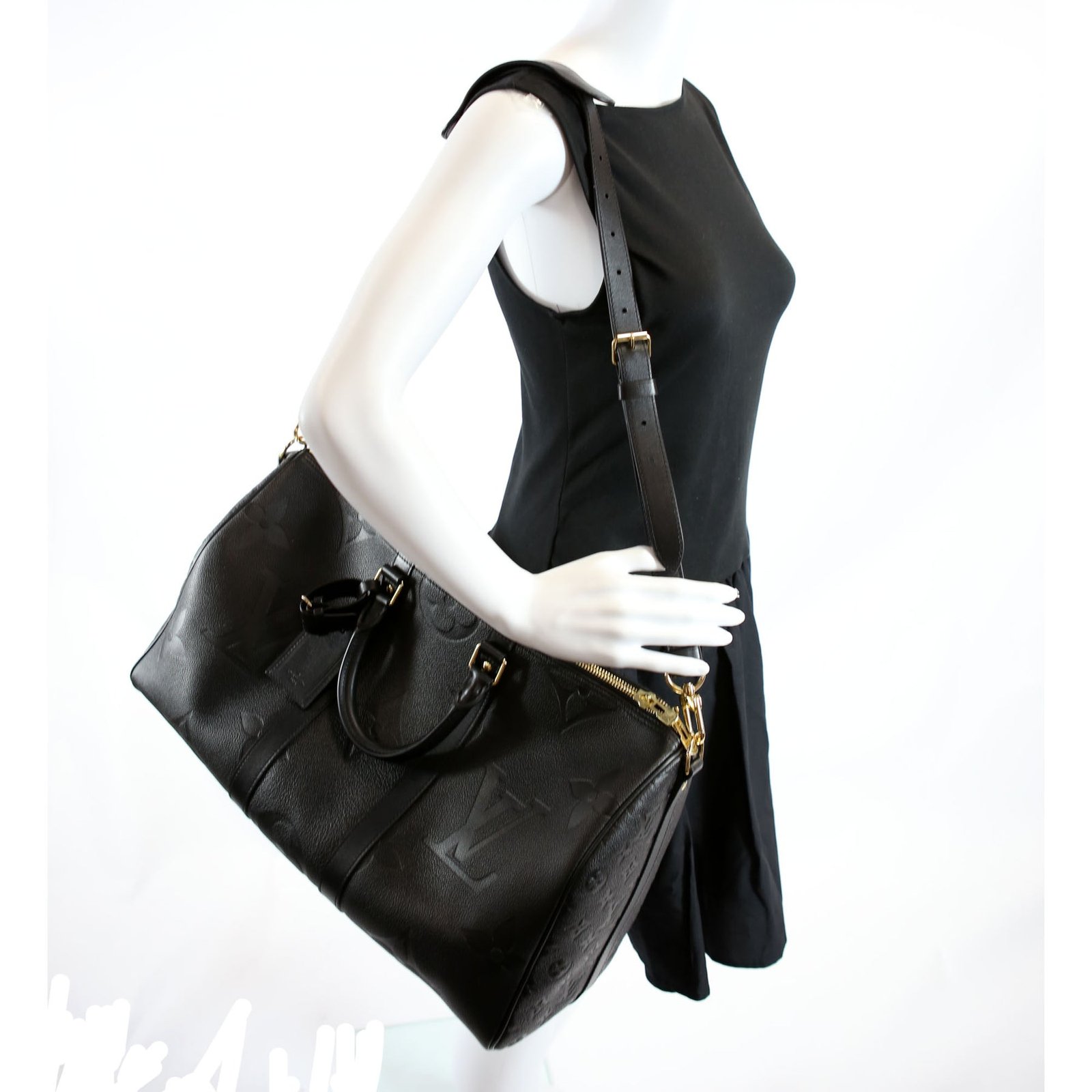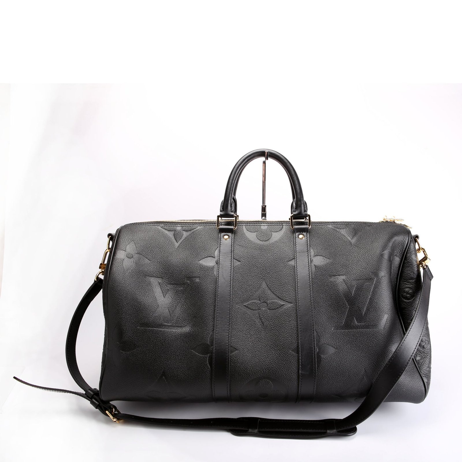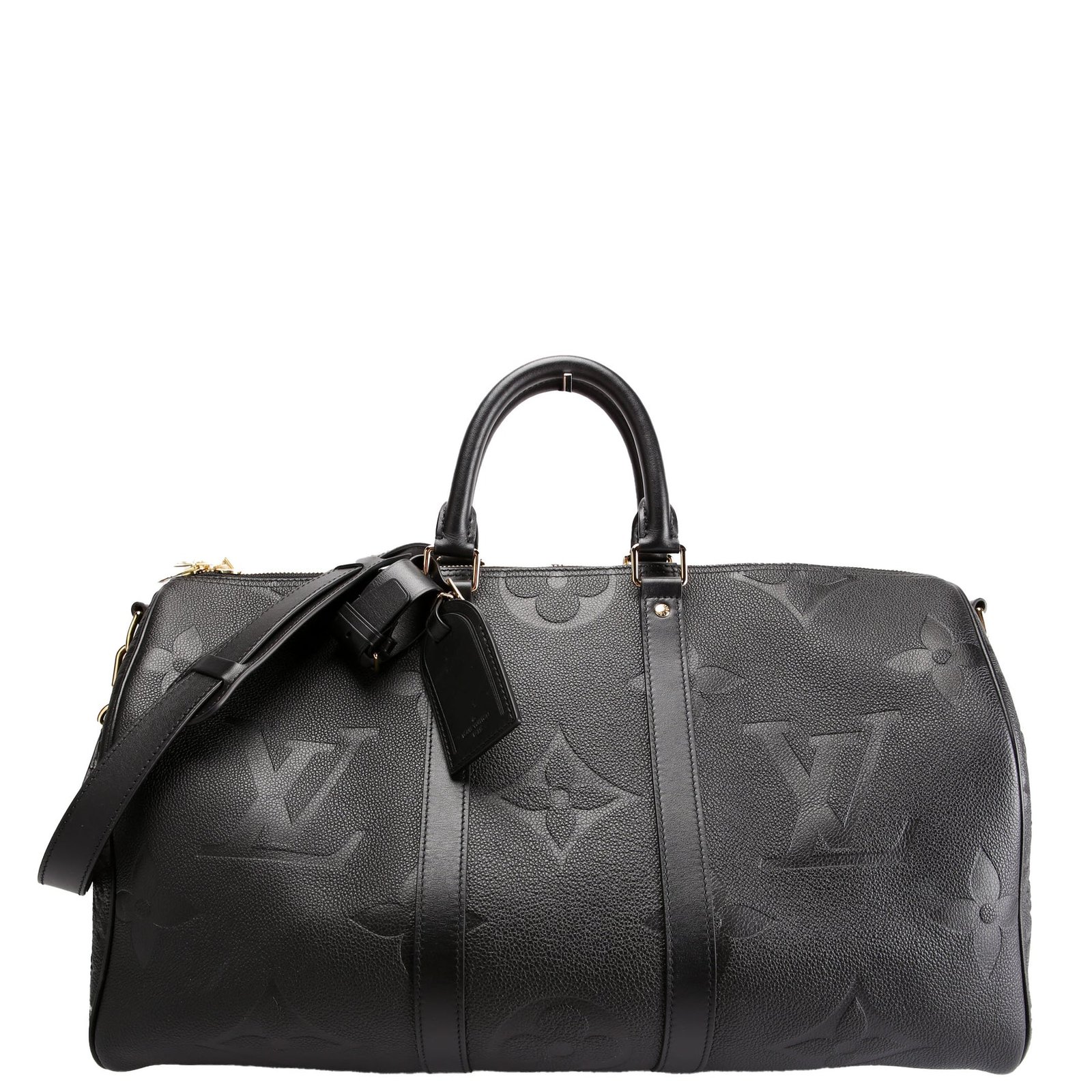 This pre-owned Louis Vuitton Keepall 45 Bandouliere guaranteed 100% authentic. The exterior is in the classic Louis Vuitton Giant Empreinte leather.