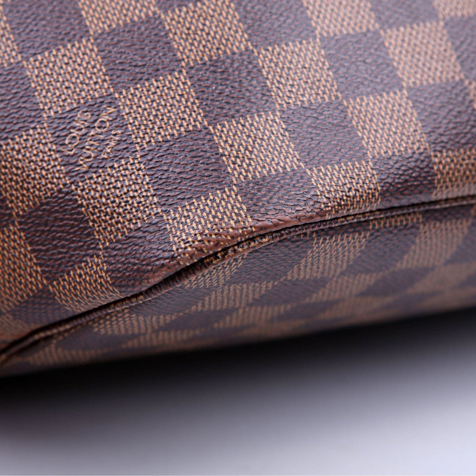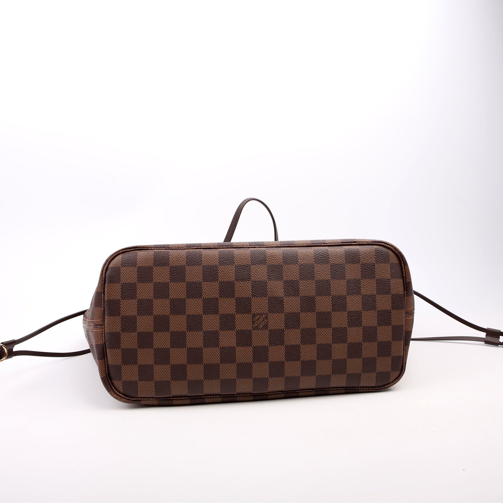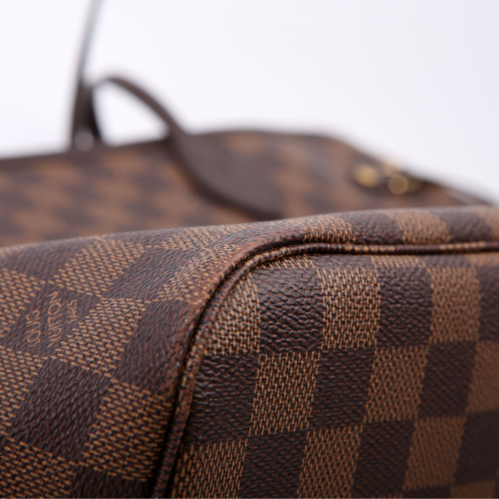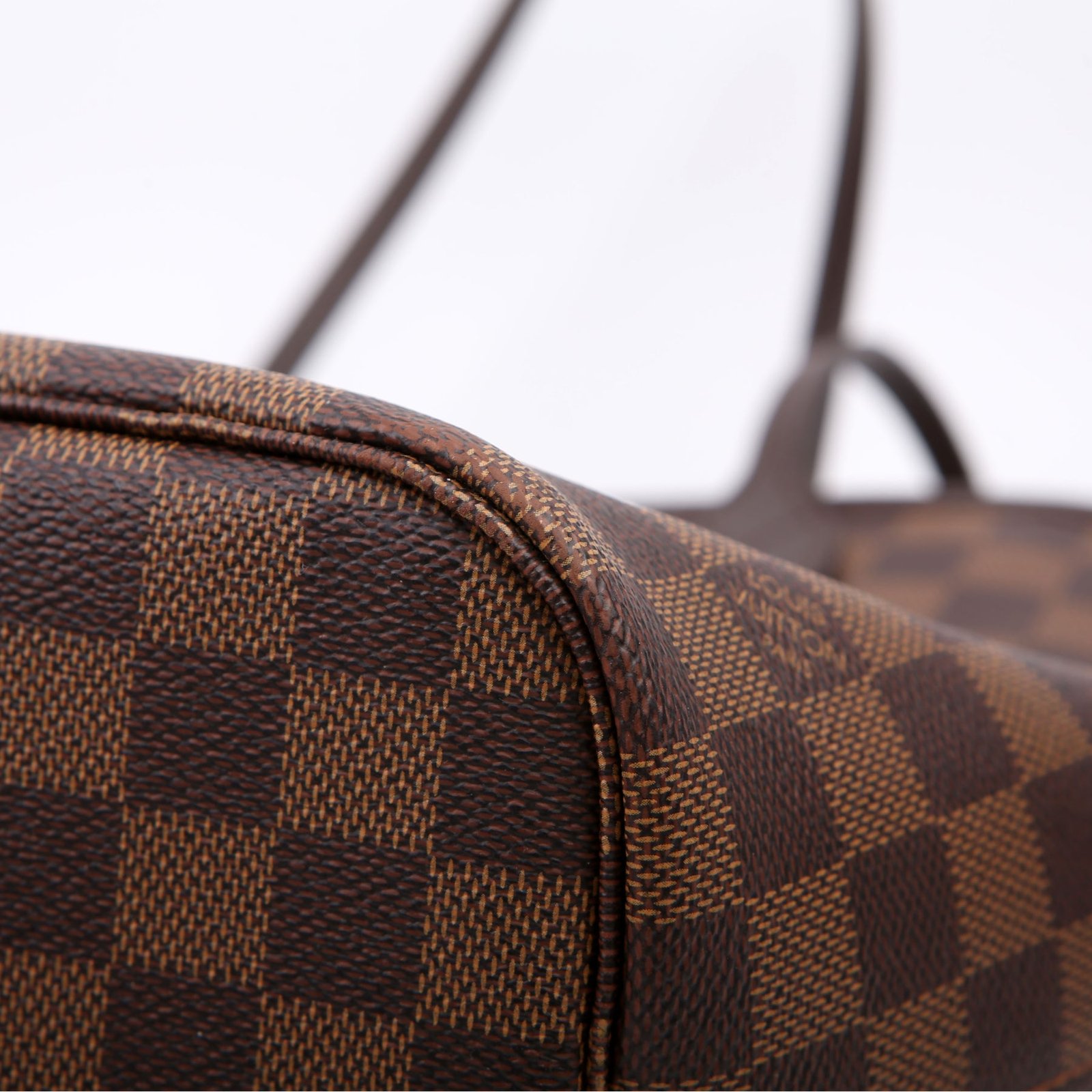 This pre-owned Louis Vuitton Neverfull MM With Wallet is guaranteed 100% authentic. The exterior is in the classic Louis Vuitton Damier Ebene coated canvas.