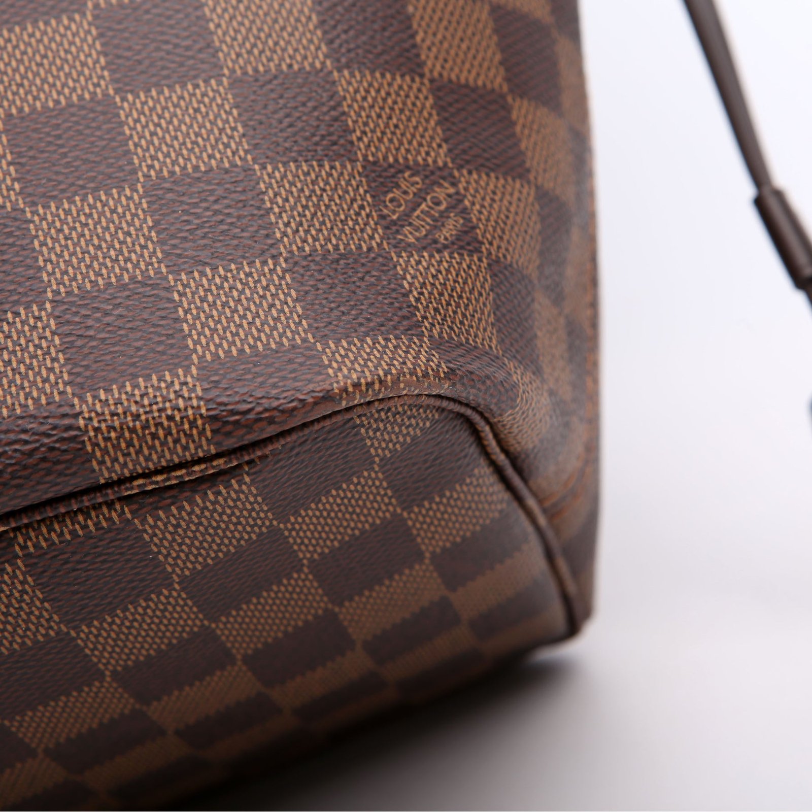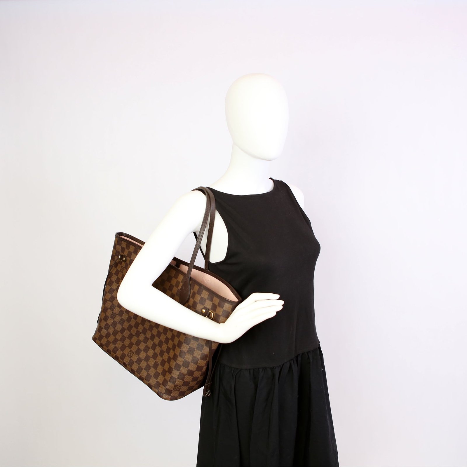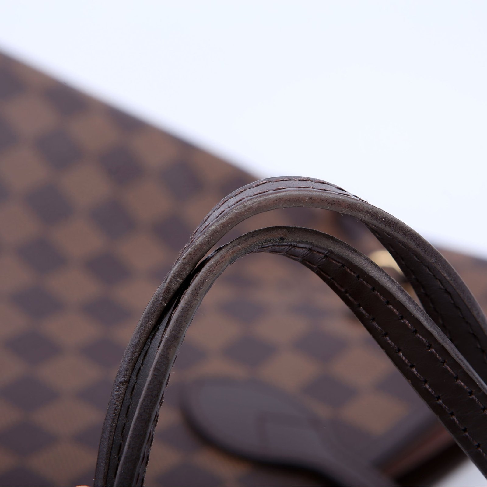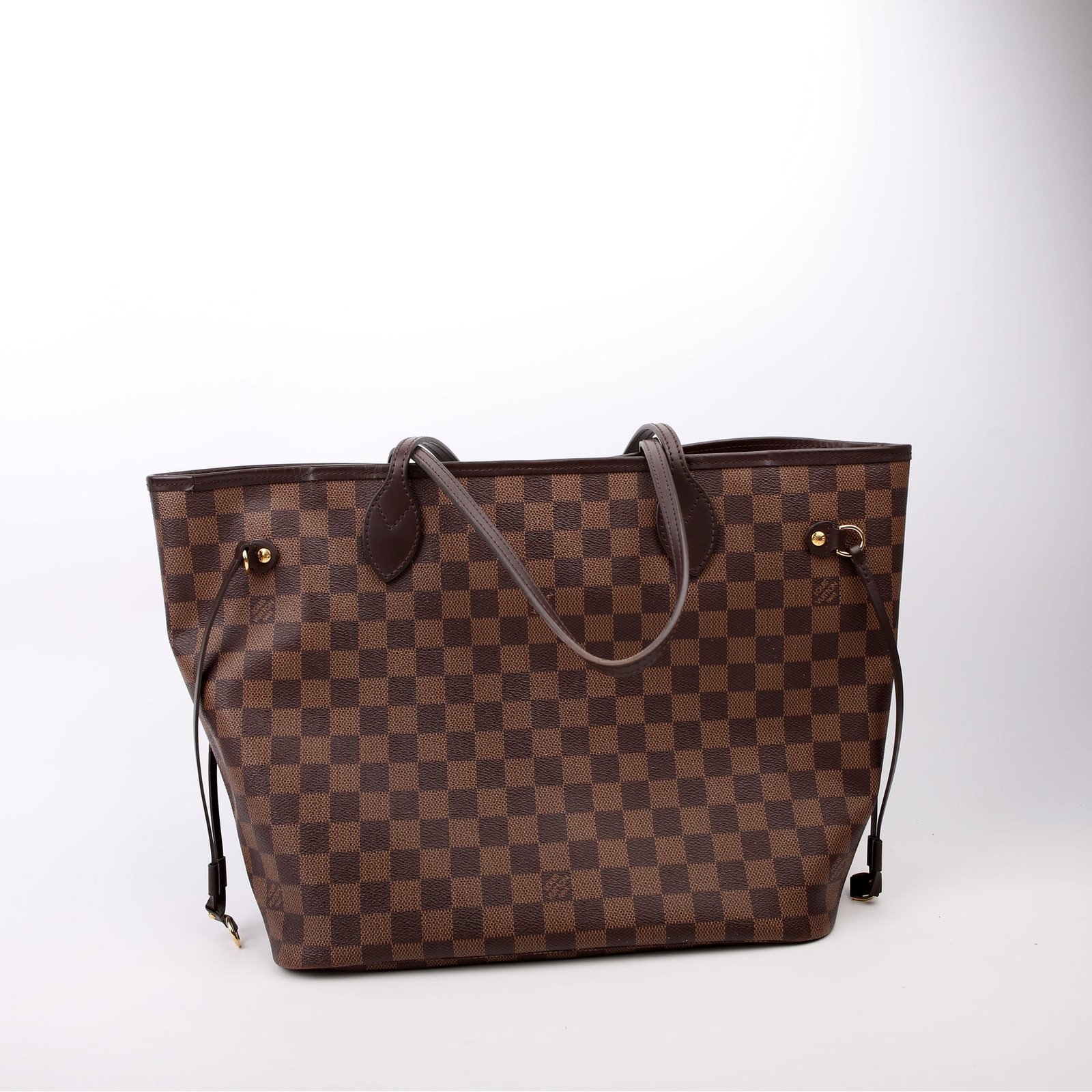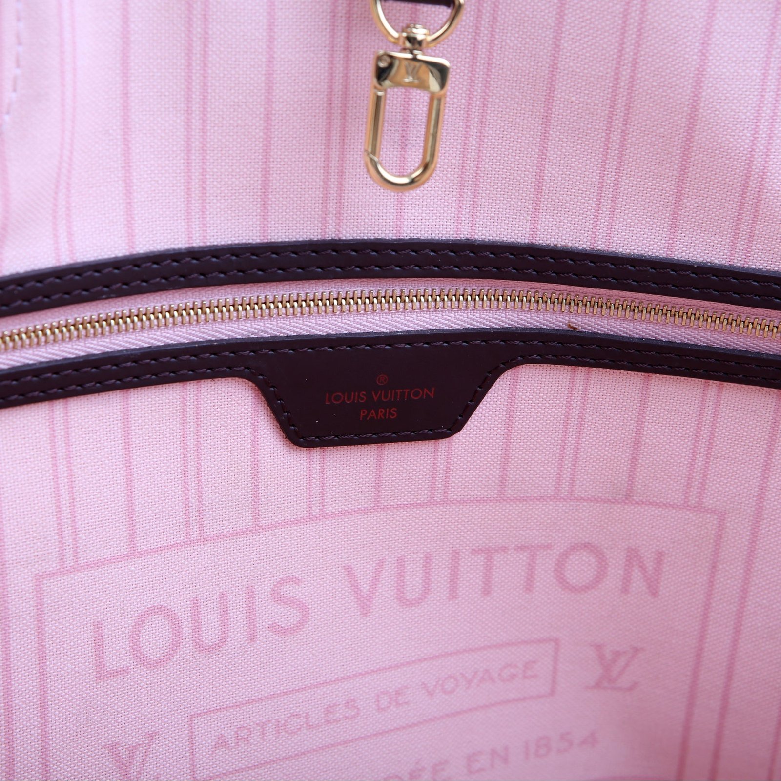 This pre-owned Louis Vuitton Neverfull MM With Wallet is guaranteed 100% authentic. The exterior is in the classic Louis Vuitton Damier Ebene coated canvas.