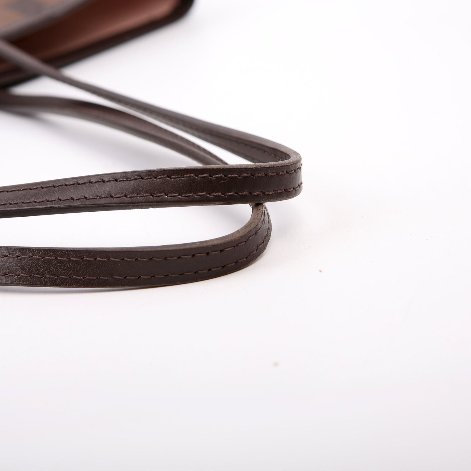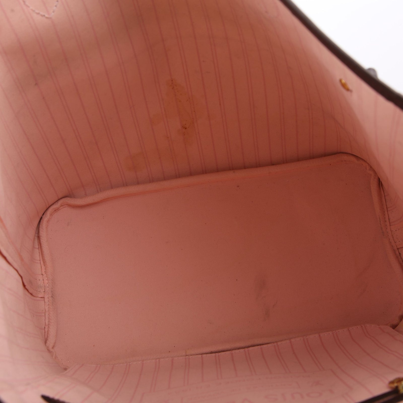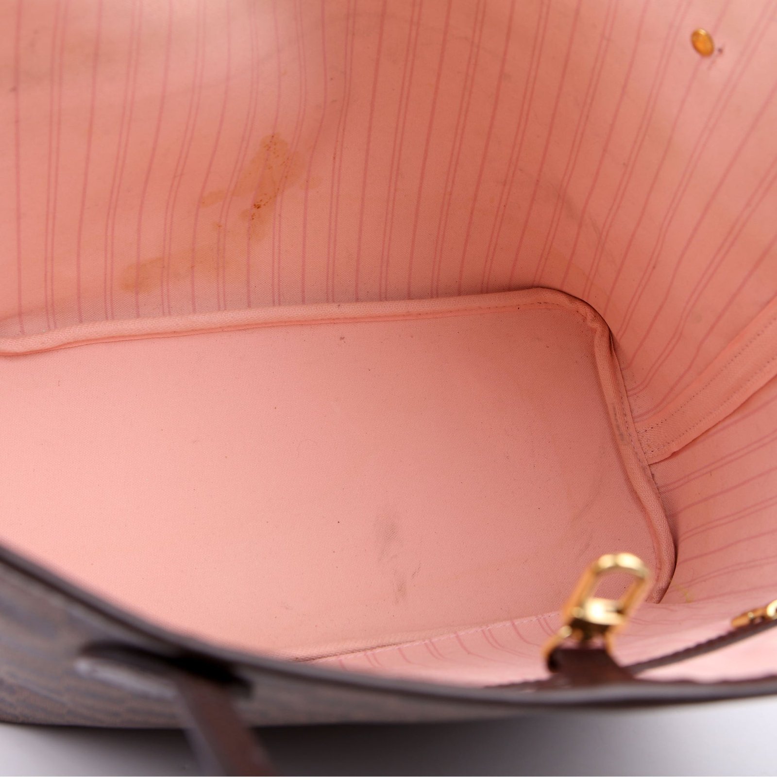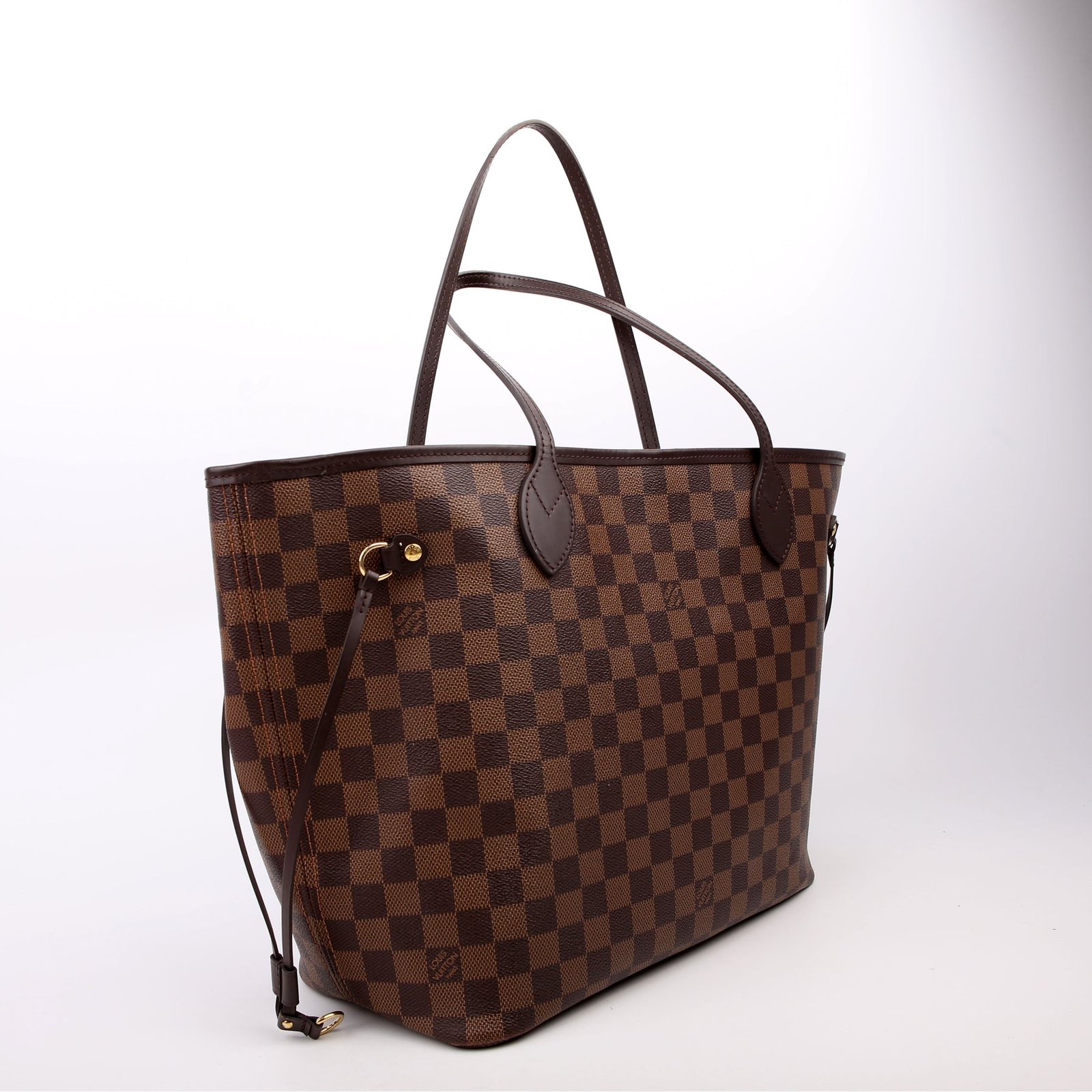 This pre-owned Louis Vuitton Neverfull MM With Wallet is guaranteed 100% authentic. The exterior is in the classic Louis Vuitton Damier Ebene coated canvas.