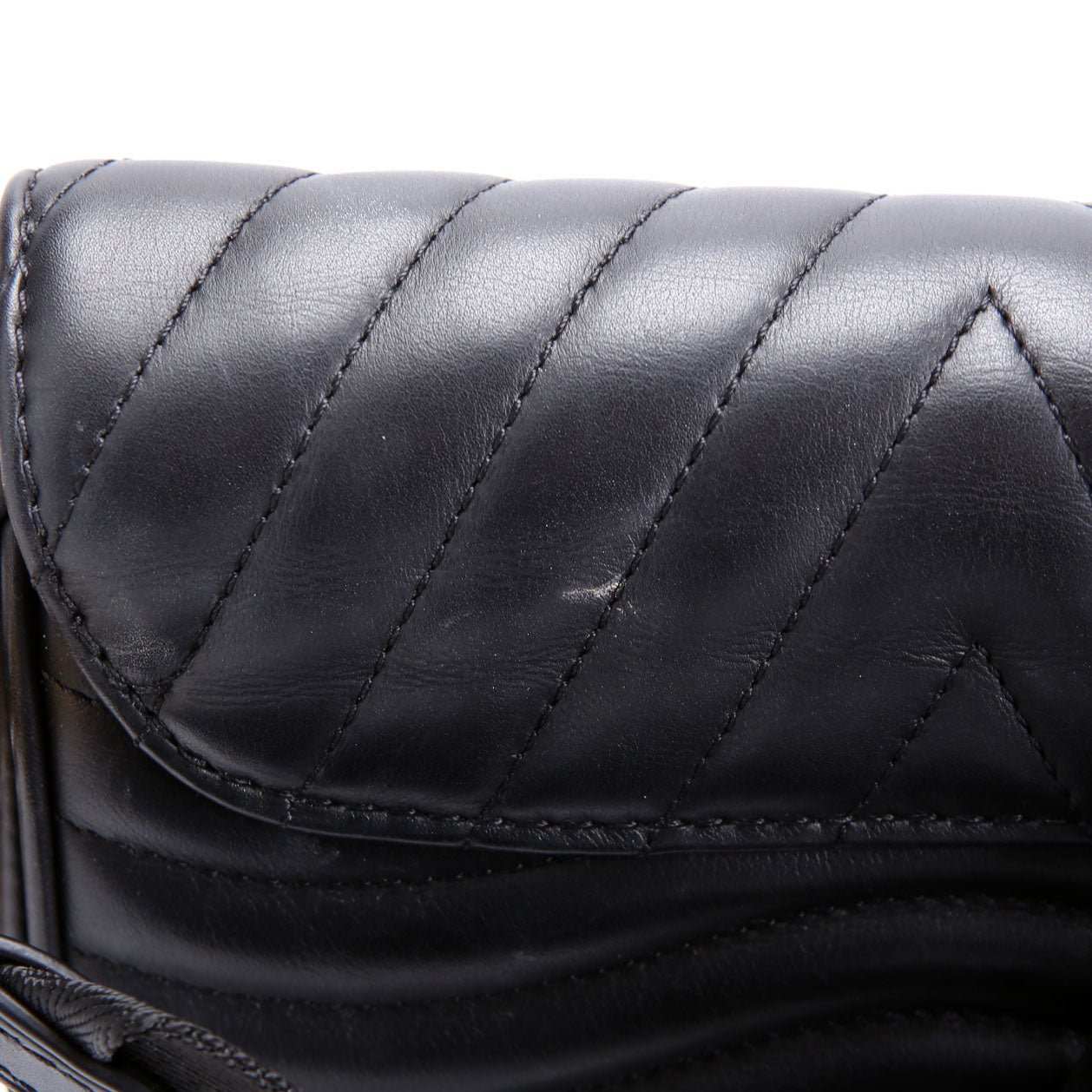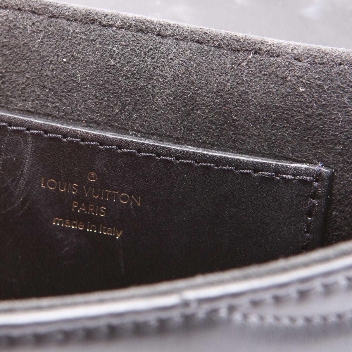 Exterior: The exterior leather shows light marks and very light glitter throughout. The base shows light scuffs and creasing.