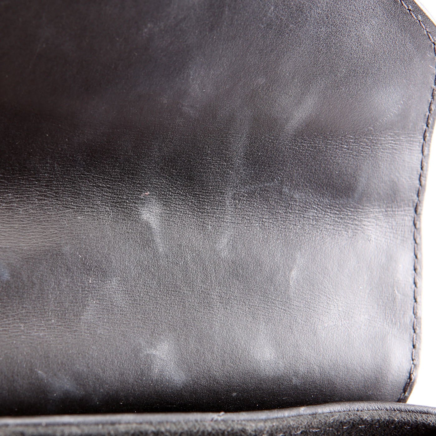 Interior: The interior shows wear throughout. The interior leather shows marks and staining. It features one open pocket.
