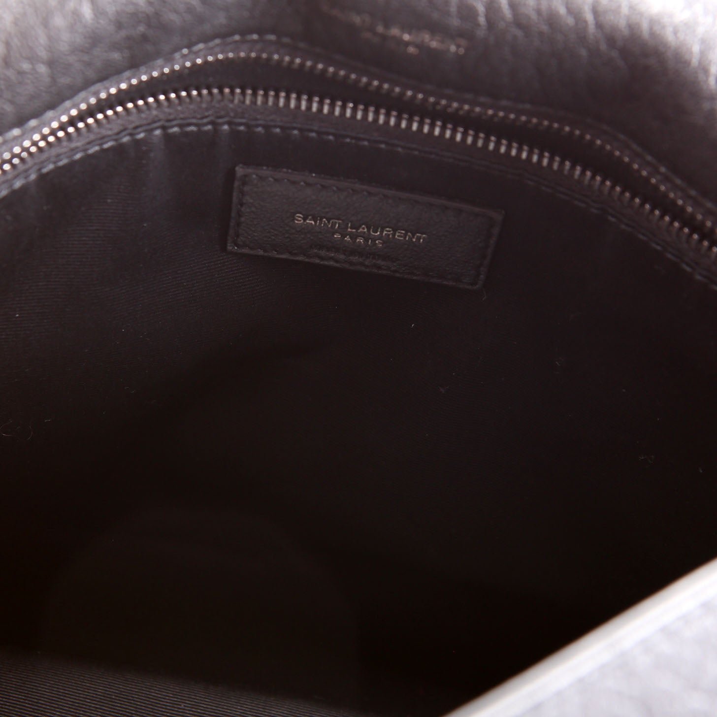 Interior: The interior shows minor wear. It features one open pocket and one zipper pocket.