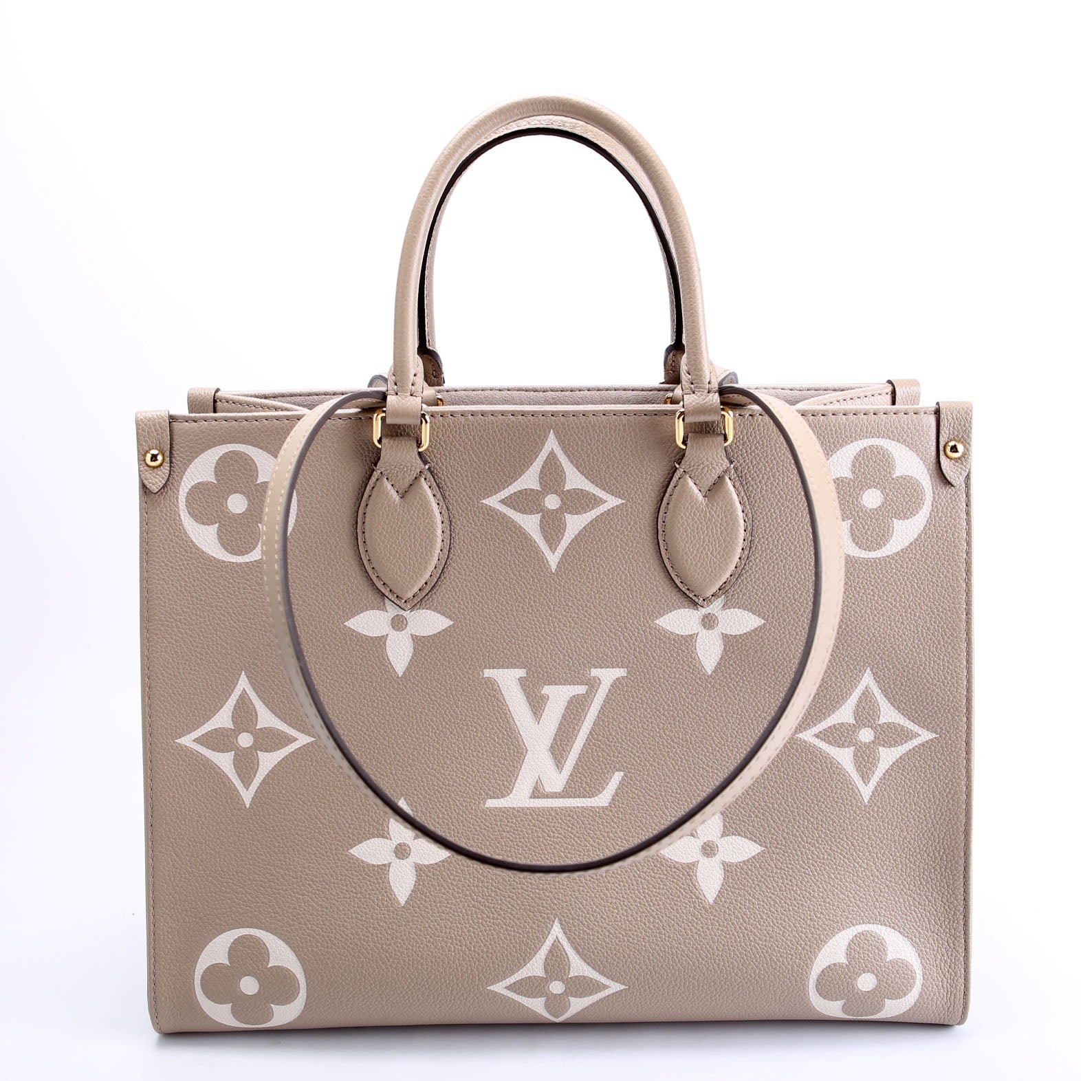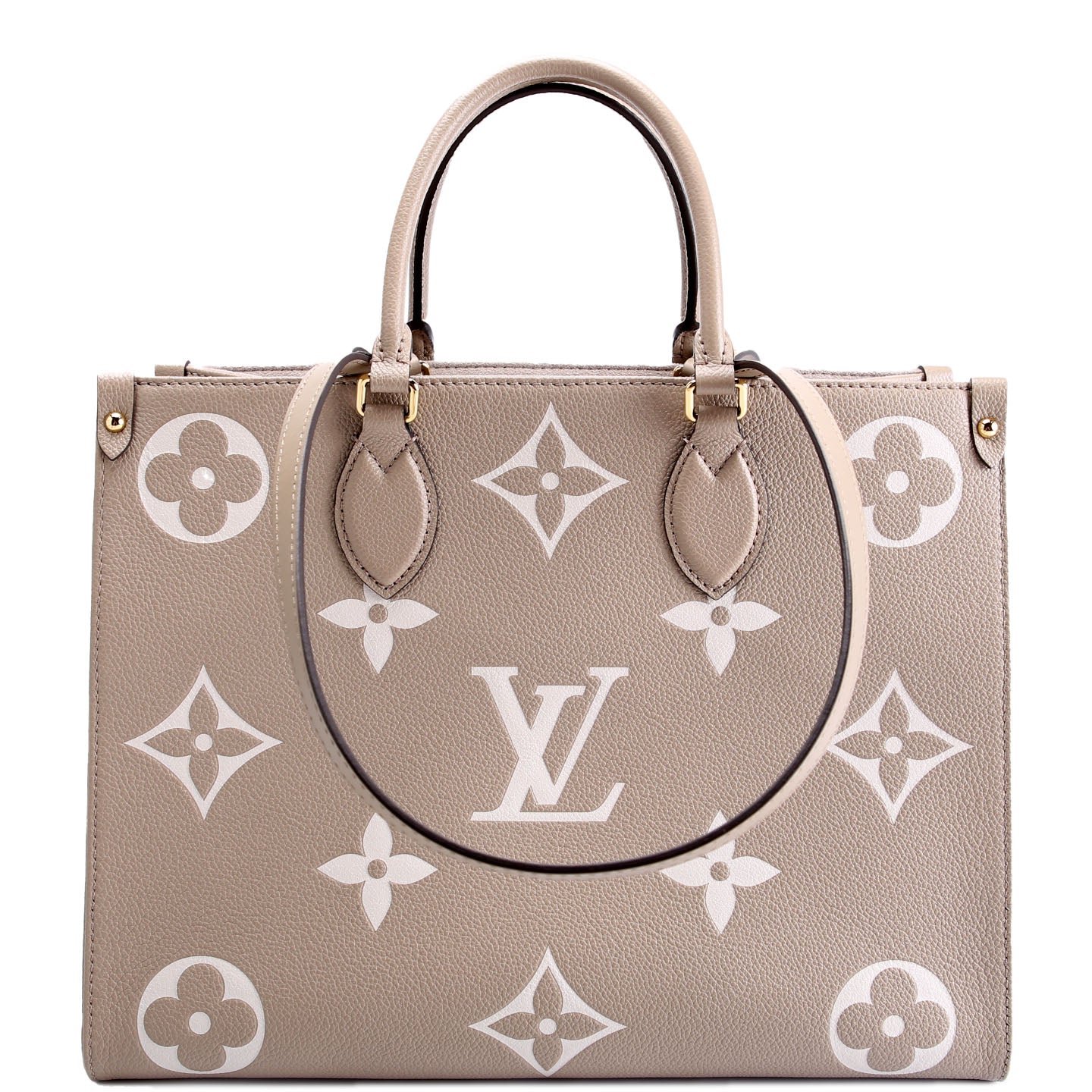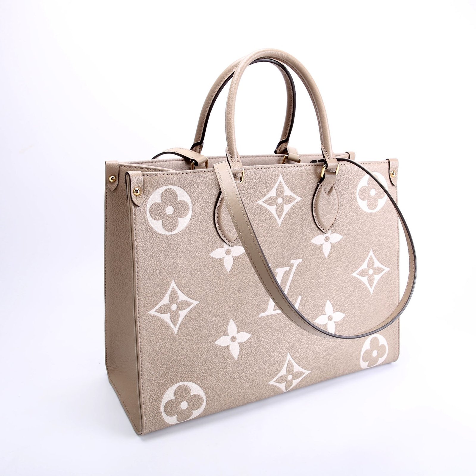 This pre-owned Louis Vuitton ONTHEGO MM is guaranteed 100% authentic. The exterior is in the classic Louis Vuitton Bicolor Empreinte leather.