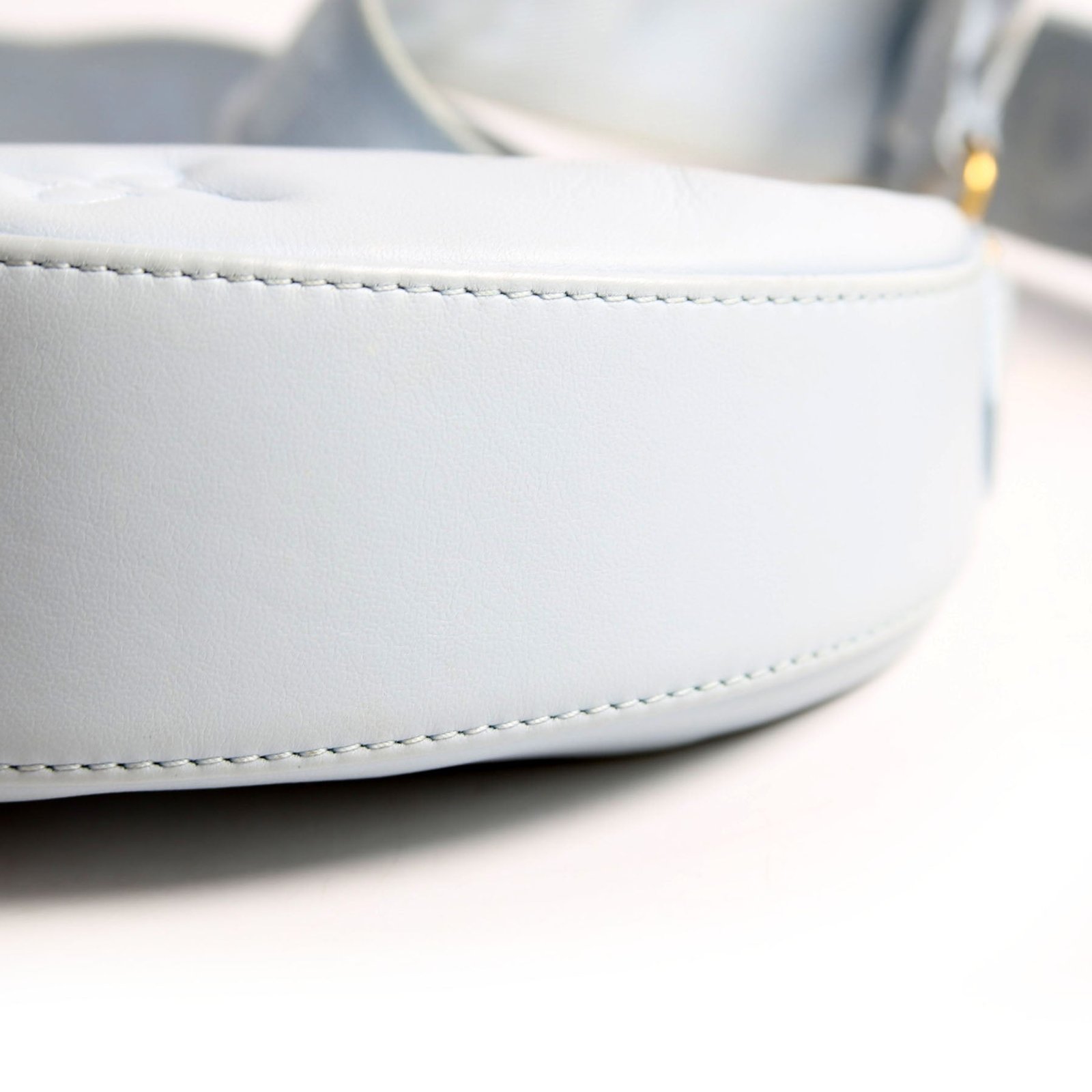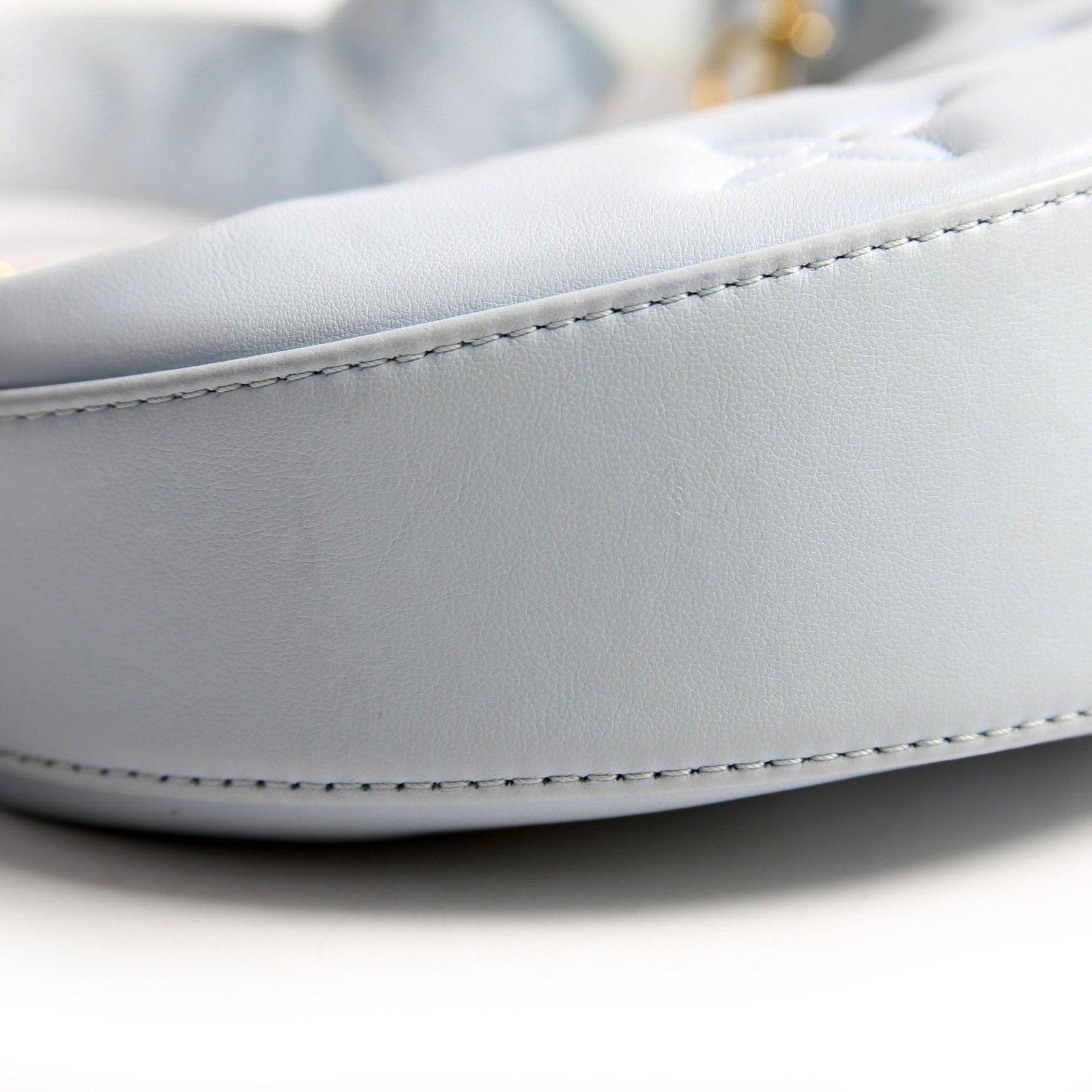 Exterior: The exterior leather shows wear throughout. The leather shows discoloration by the creasing. There are scuffs throughout. The leather by the hardware shows discoloration.