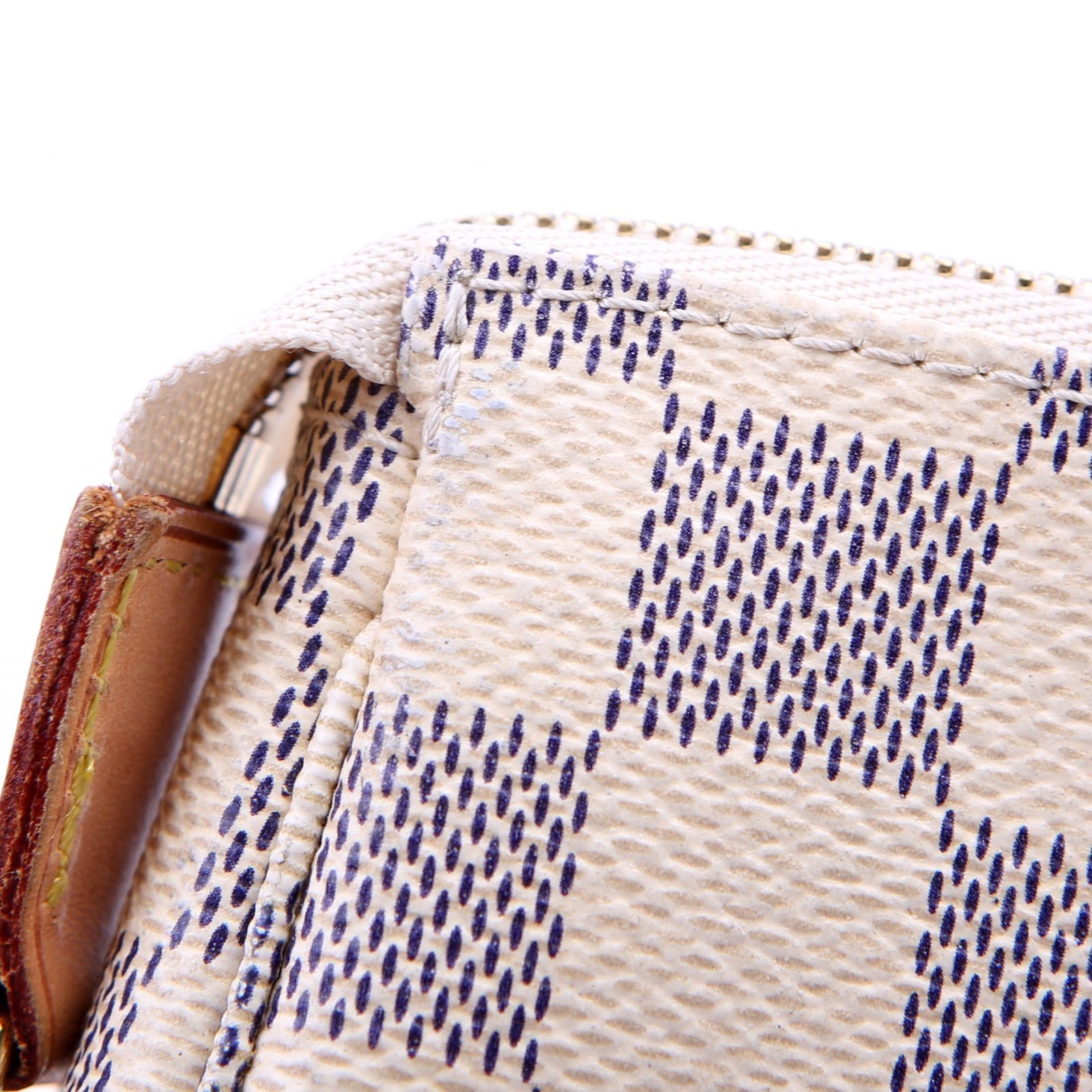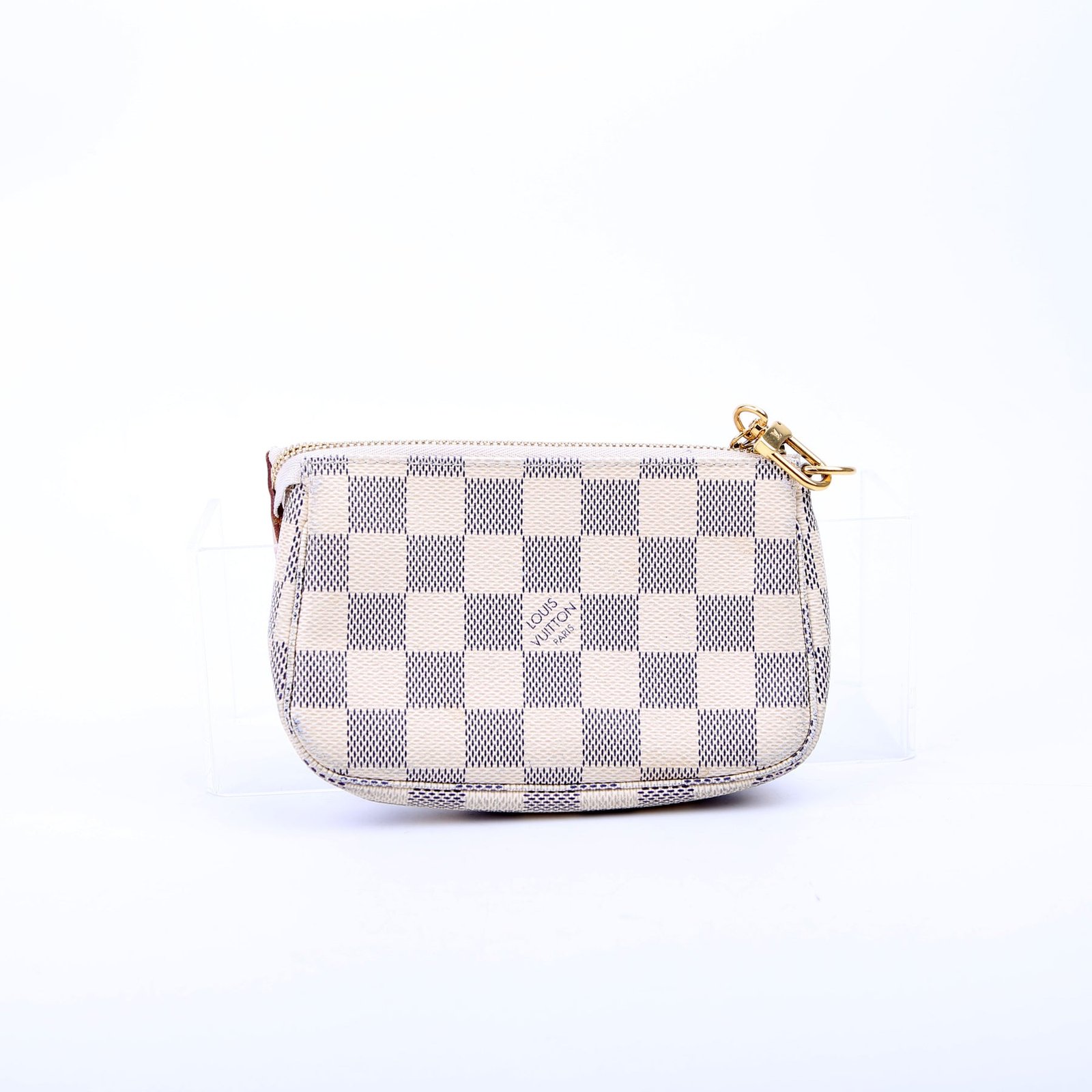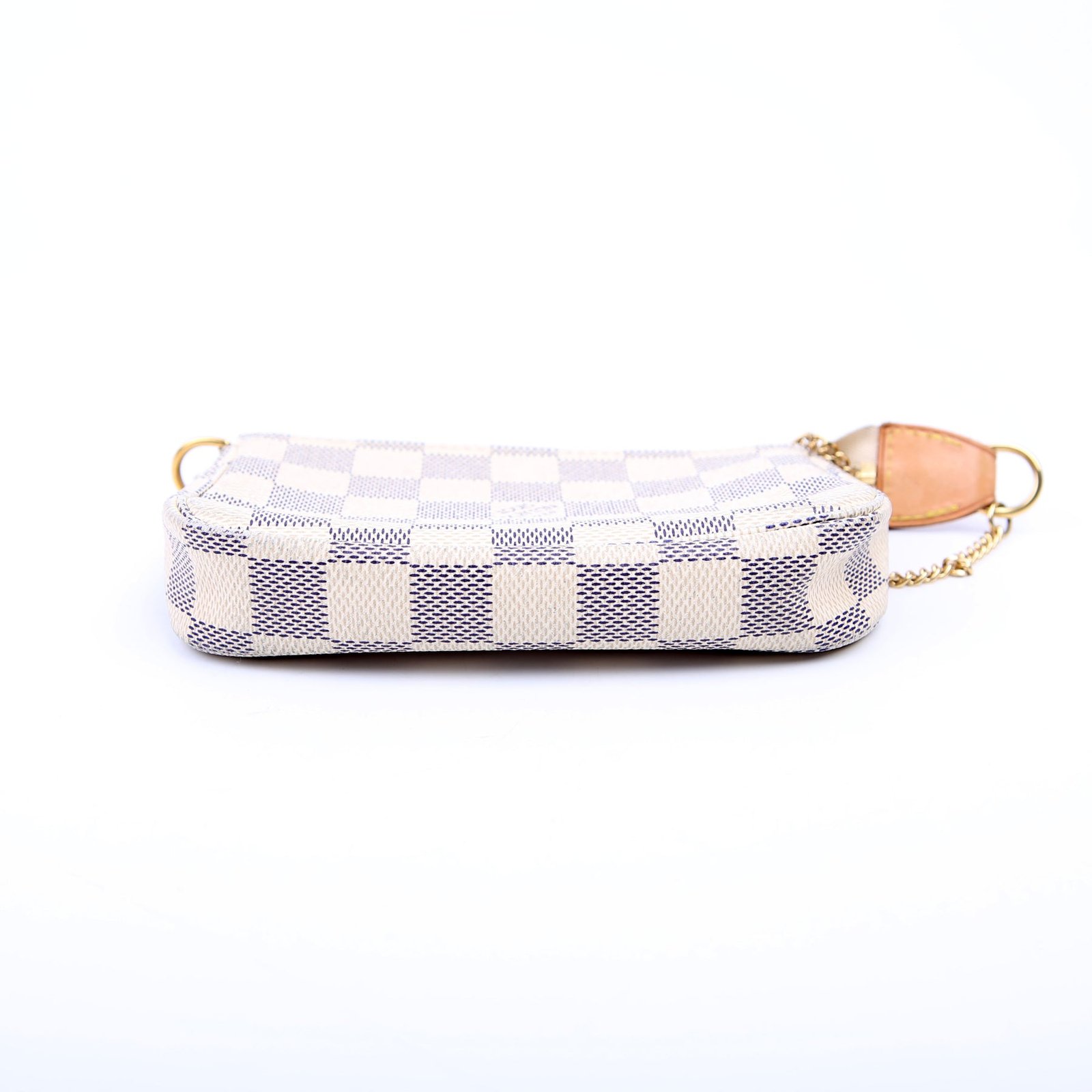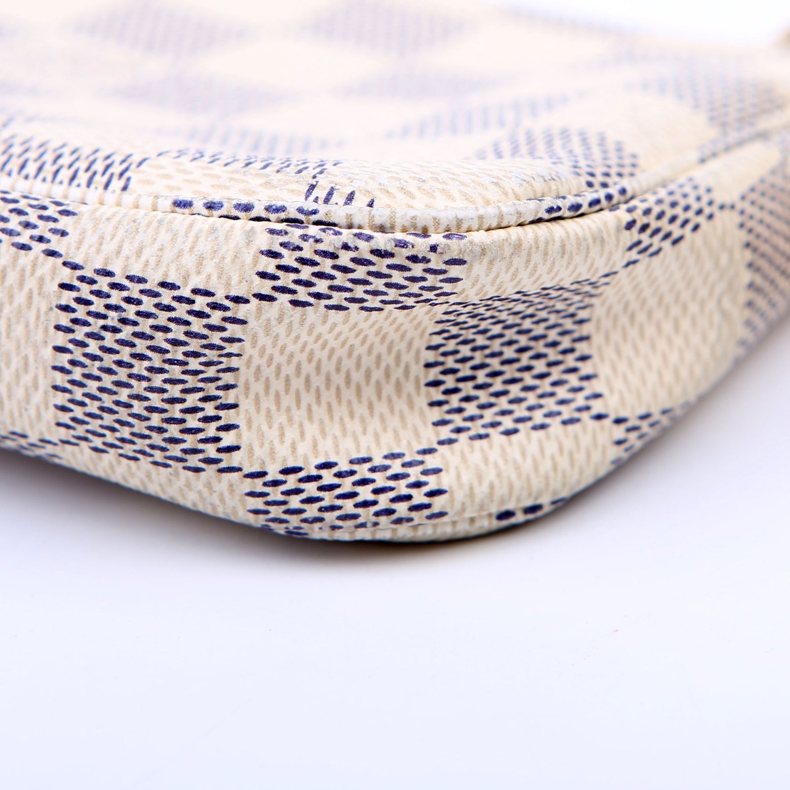 This pre-owned Louis Vuitton Pochette Accessories Mini is guaranteed 100% authentic. The exterior is in the classic Louis Vuitton Damier Azur coated canvas.