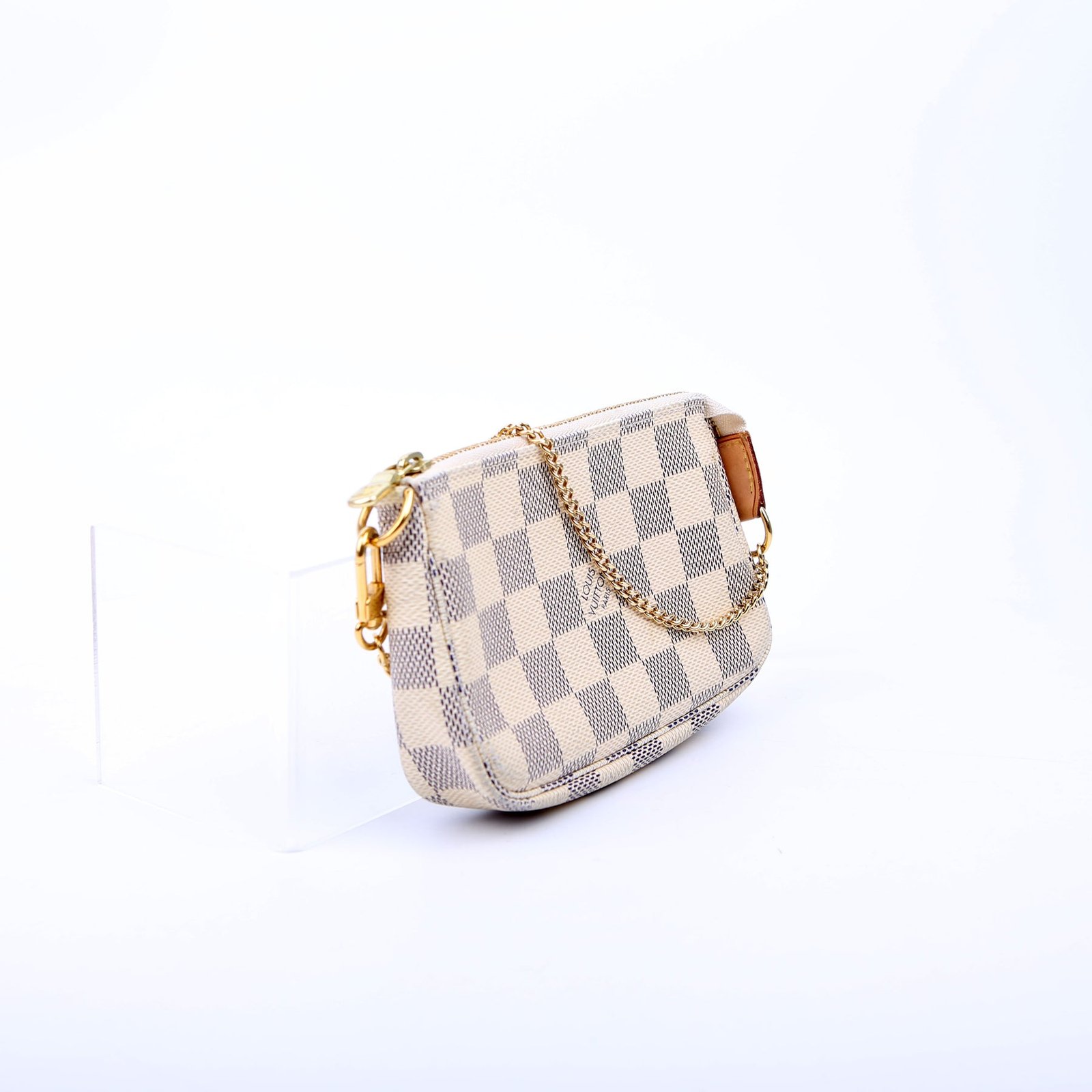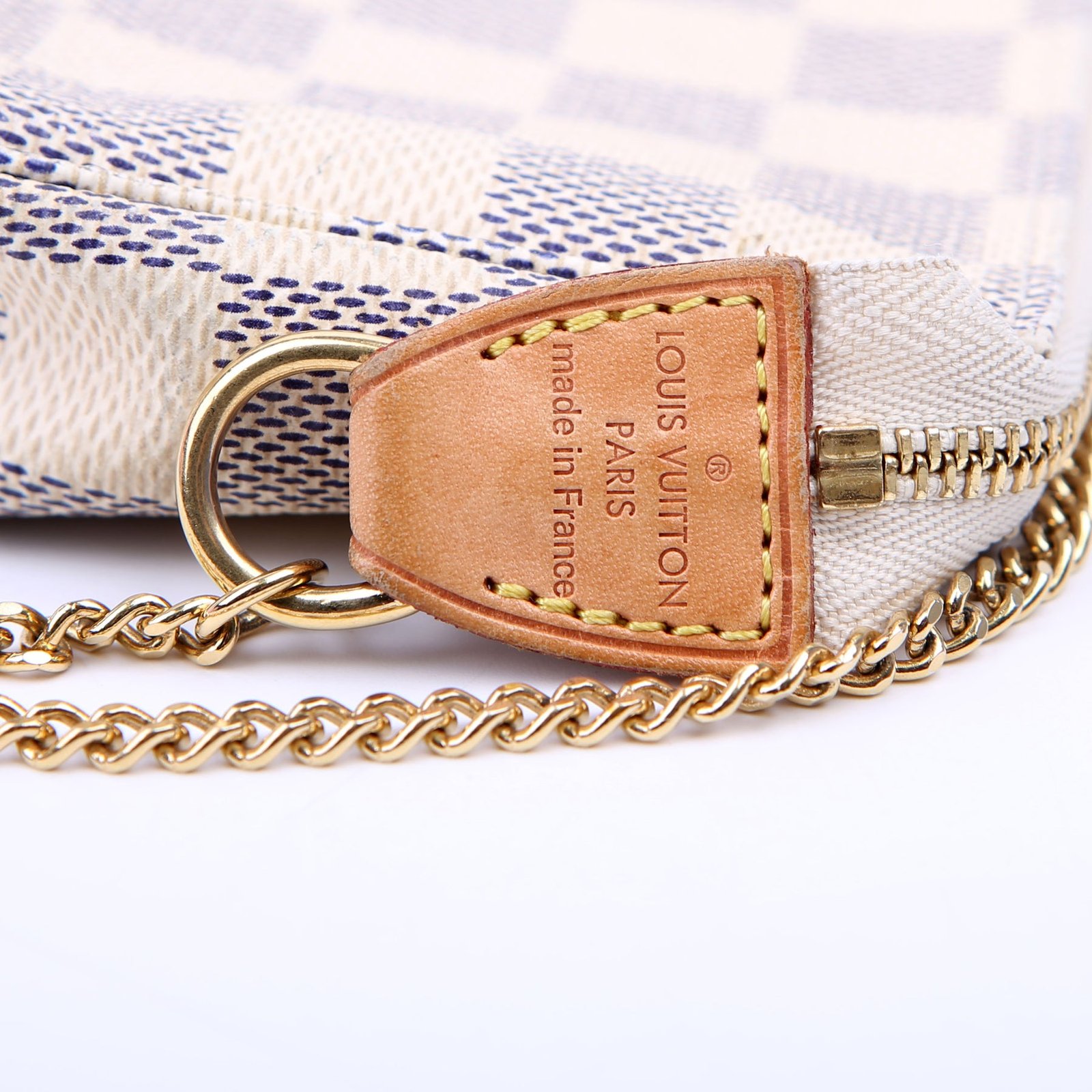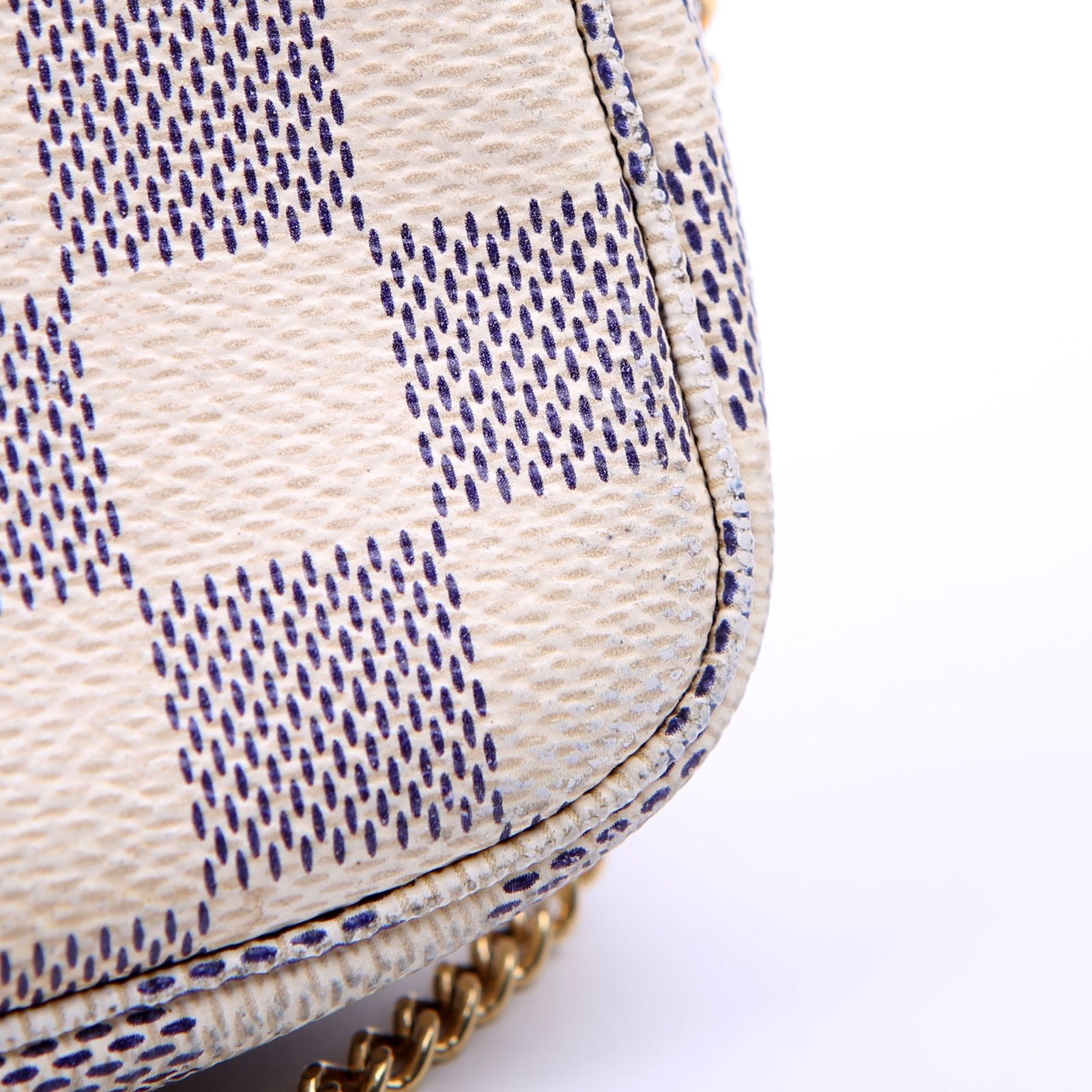 This pre-owned Louis Vuitton Pochette Accessories Mini is guaranteed 100% authentic. The exterior is in the classic Louis Vuitton Damier Azur coated canvas.