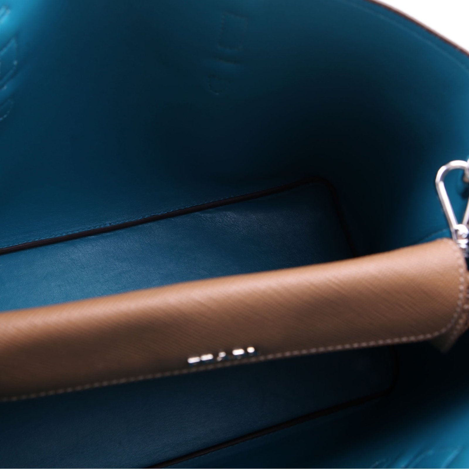 Interior: The interior has a minor smoke odor. It features one compartment with a snap closure and two open sections. The leather has light scuffs.