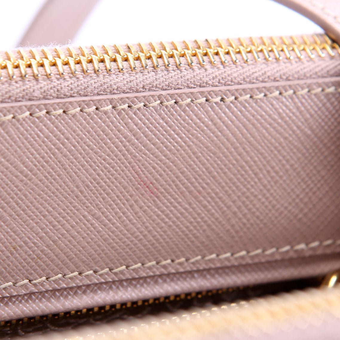 Interior: The interior features some pen marks and one stain on top of the bag. The interior features three zippy pockets and one open pocket.