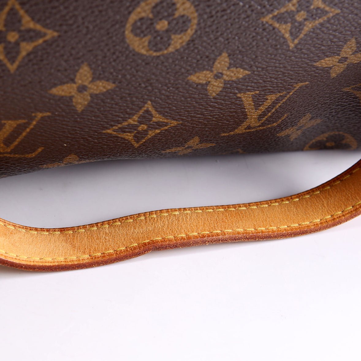 Handle: The leather handles show staining and wear. The piping shows cracking.