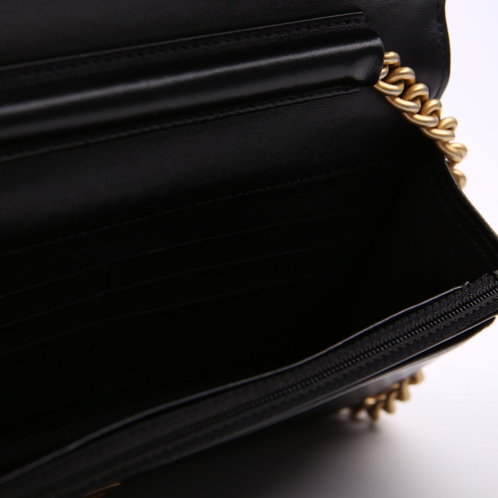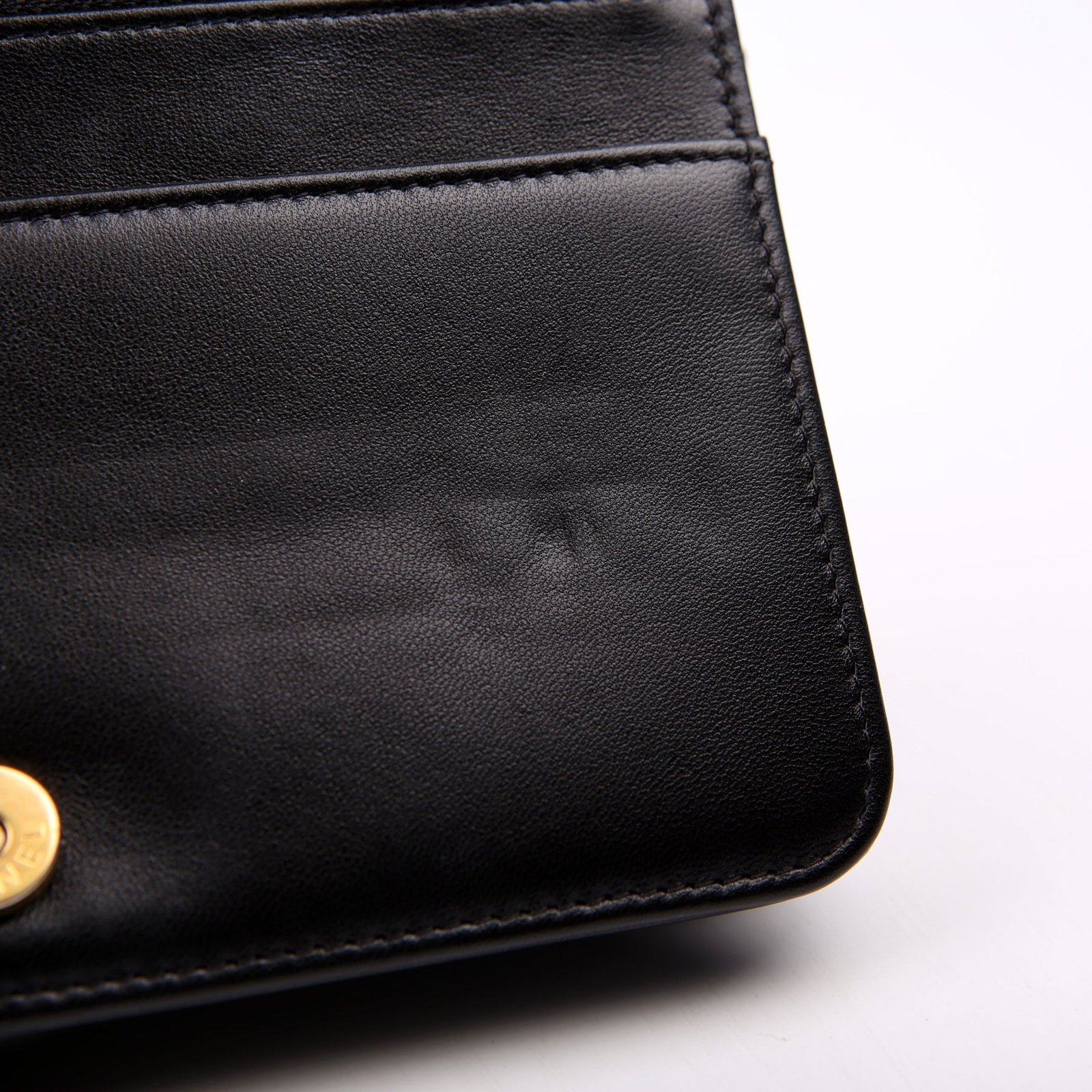 Interior: The interior has minor indents and scratches throughout. The interior features two zip closure pockets, two open pockets, and six card slots.