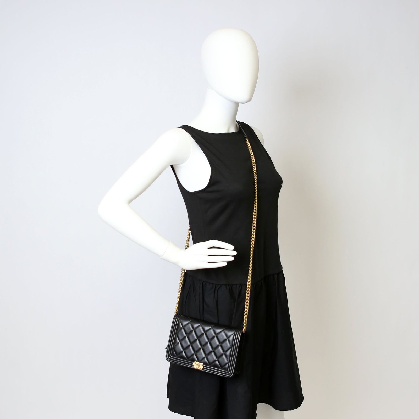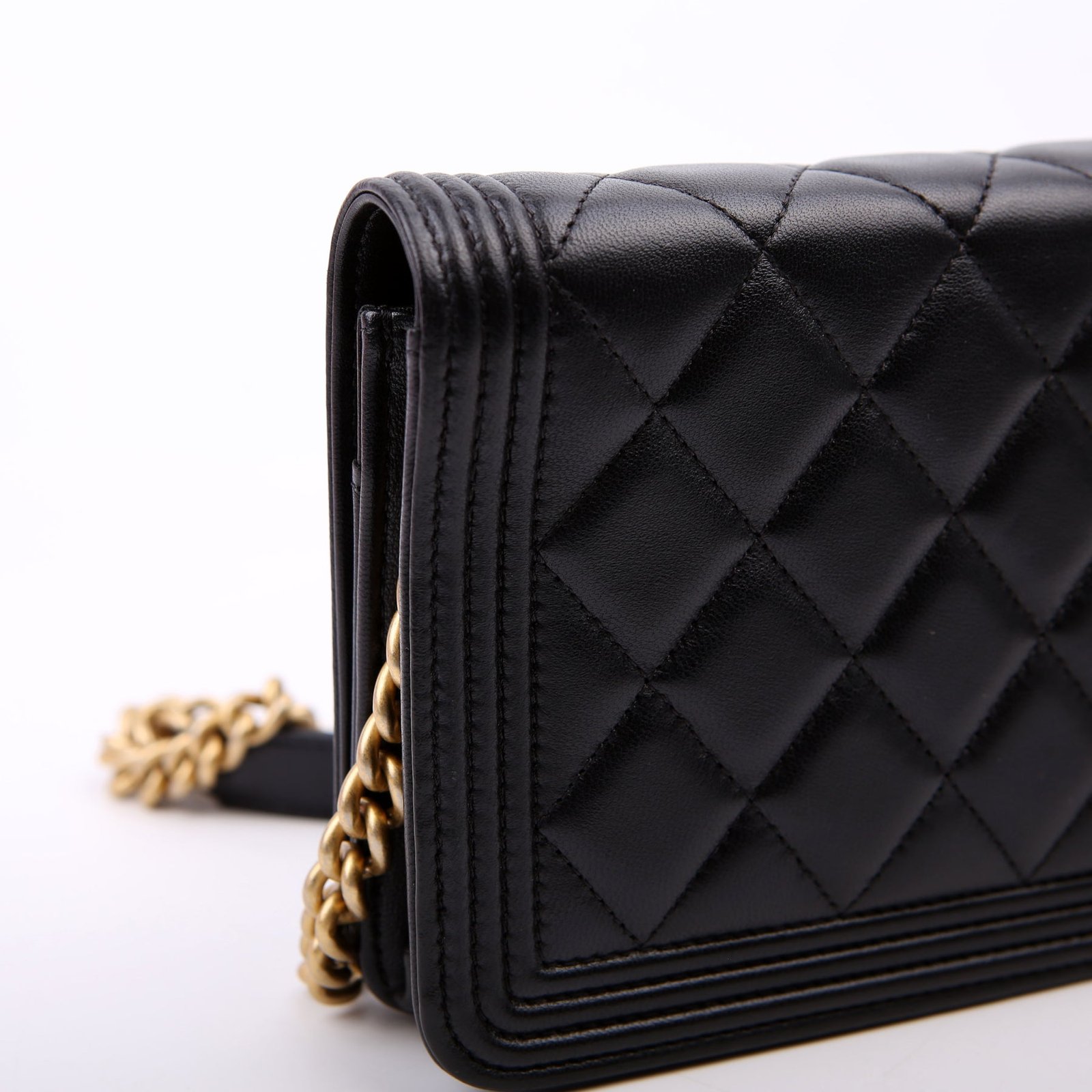 This pre-owned Chanel WOC Boy is guaranteed 100% authentic. The exterior is in the classic Chanel Lambskin leather.